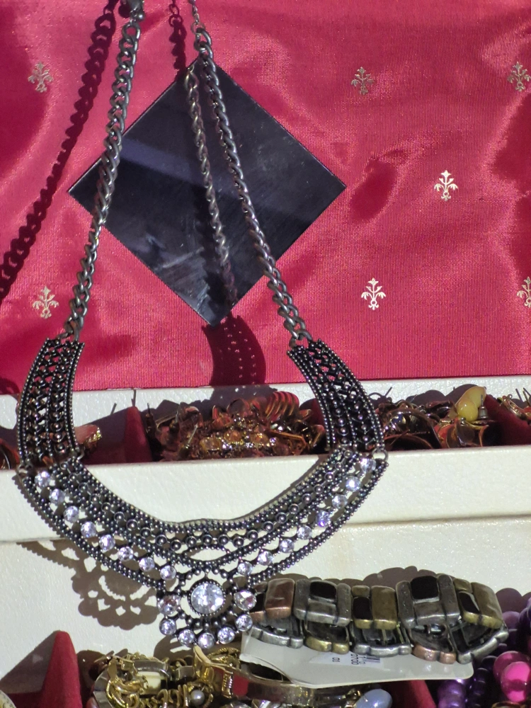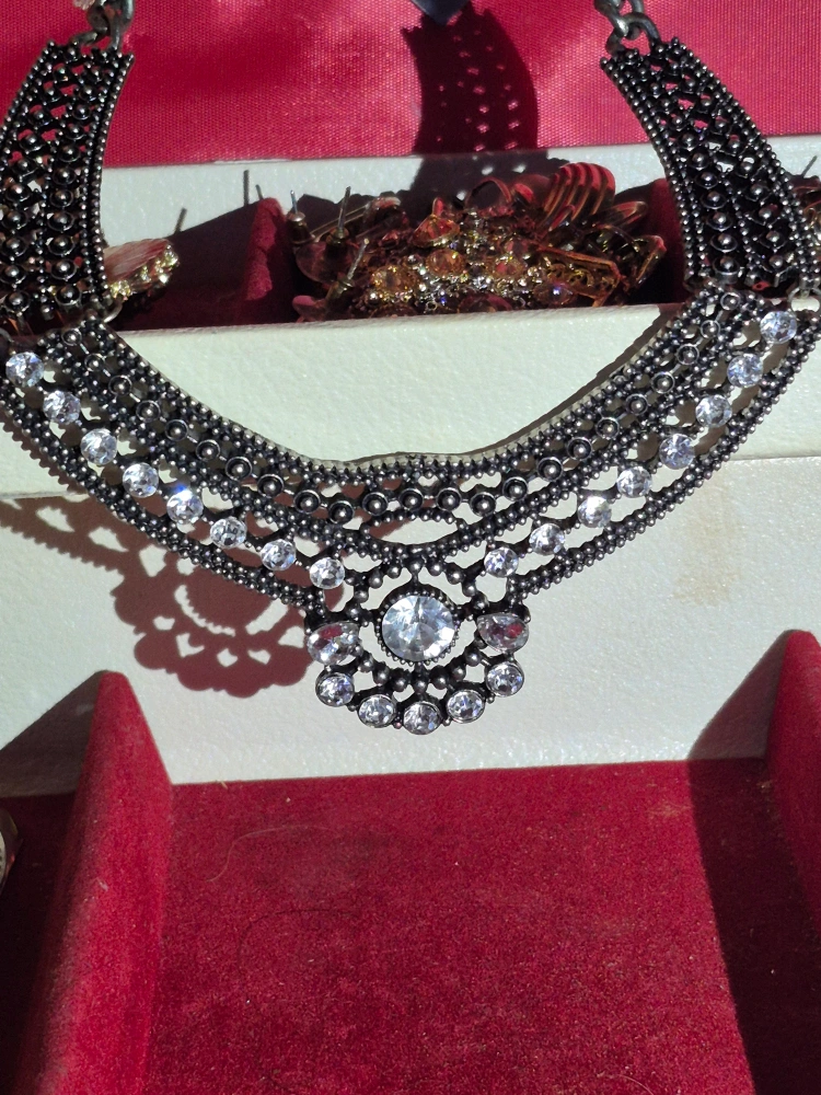 Beautiful dark metal statement necklace. Features clear rhinestones. Intricate design. Perfect for a special occasion.