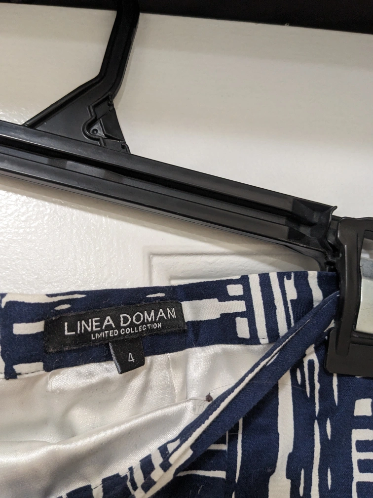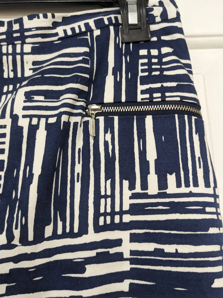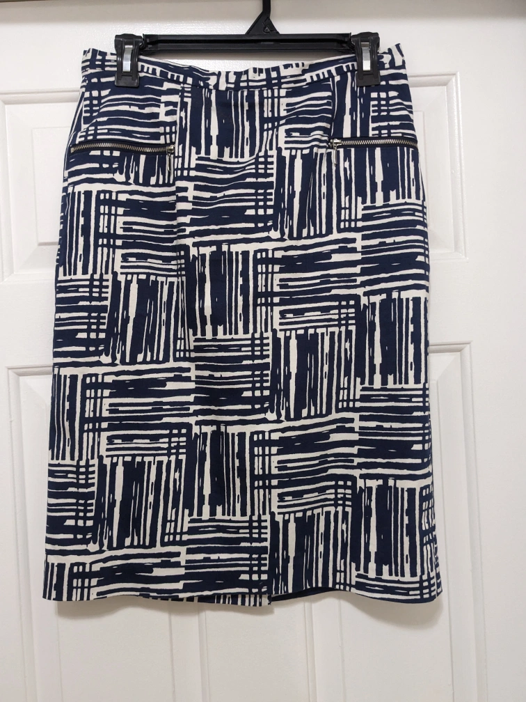 Women's knee-length skirt. Size 4. Dark blue and white geometric print. Zip pockets. Excellent condition.