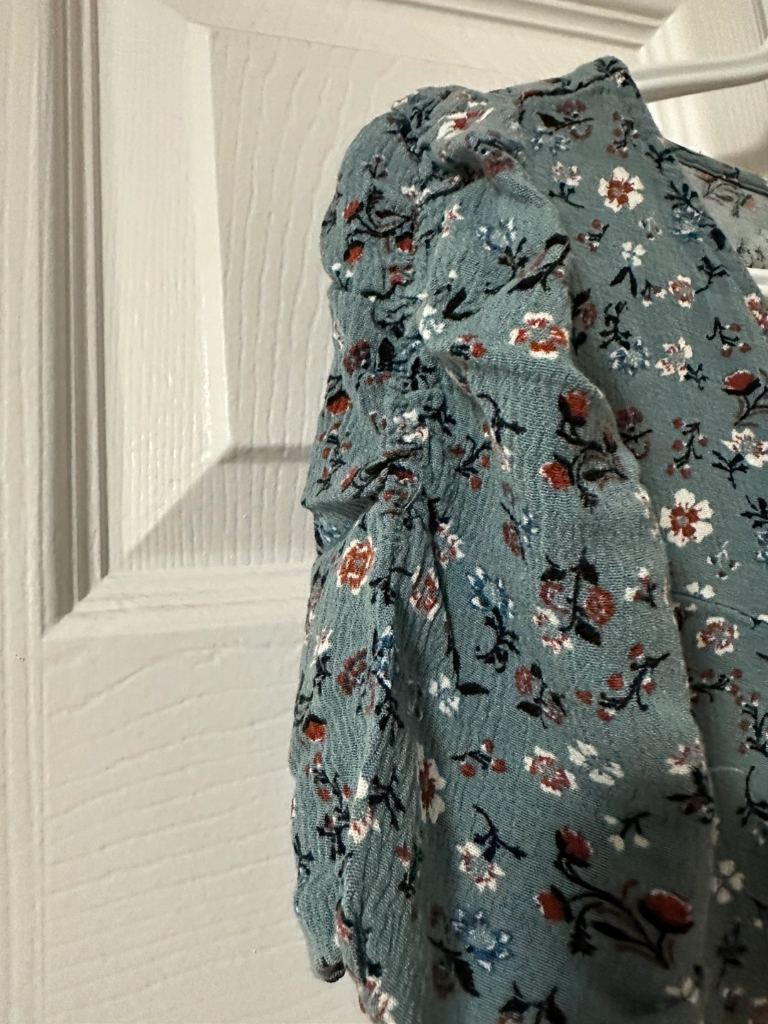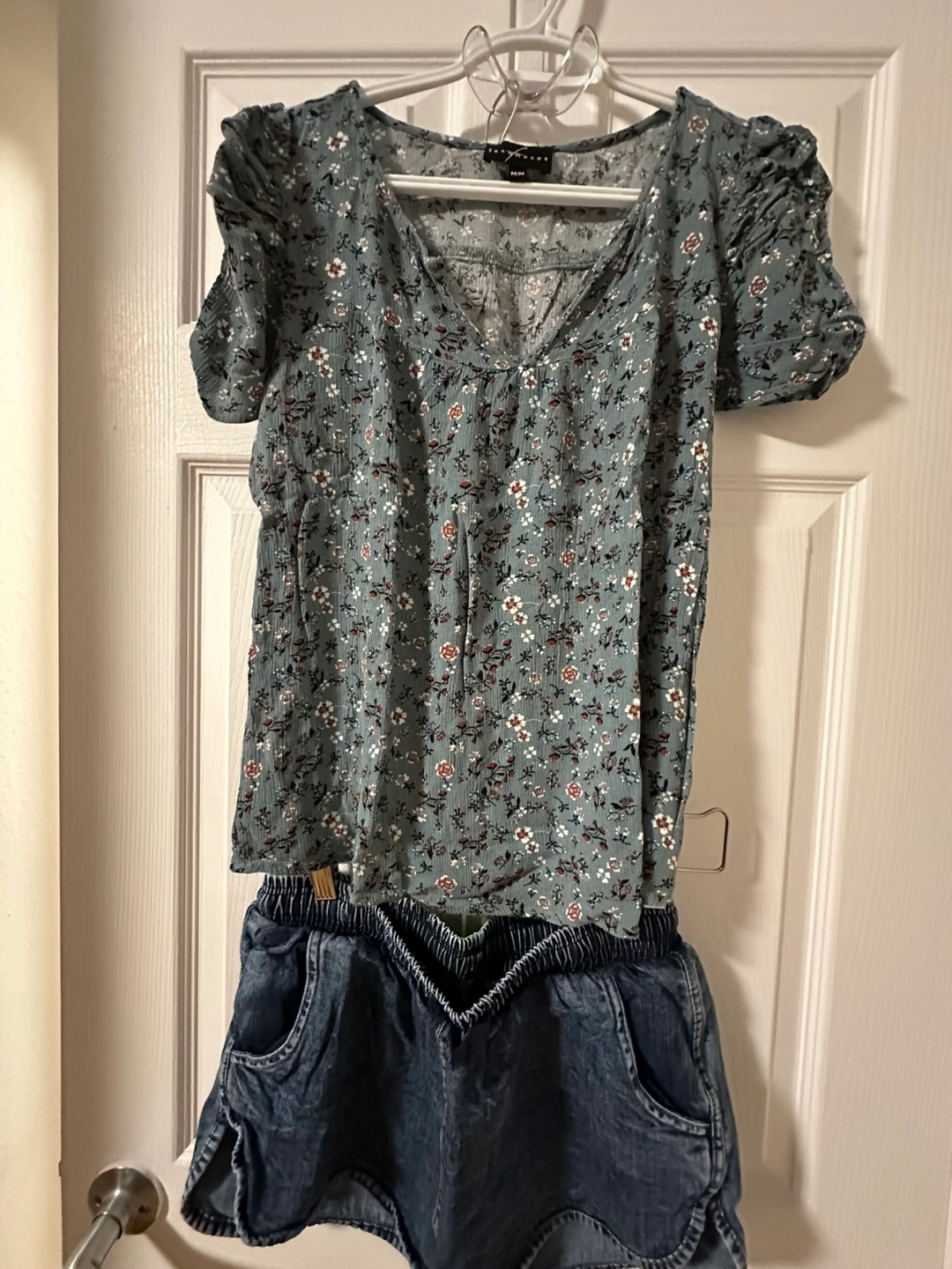 Cute summer outfit. Floral print blouse, puff sleeves, V-neck. Denim shorts, elastic waistband, size 32. Perfect for a casual day out.