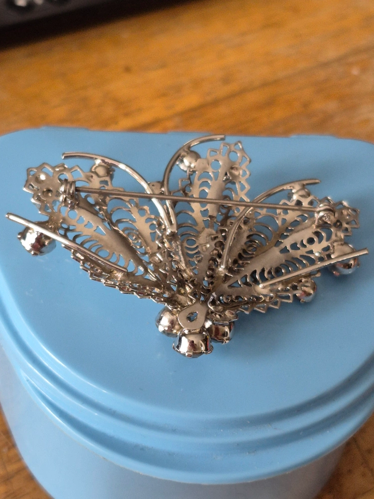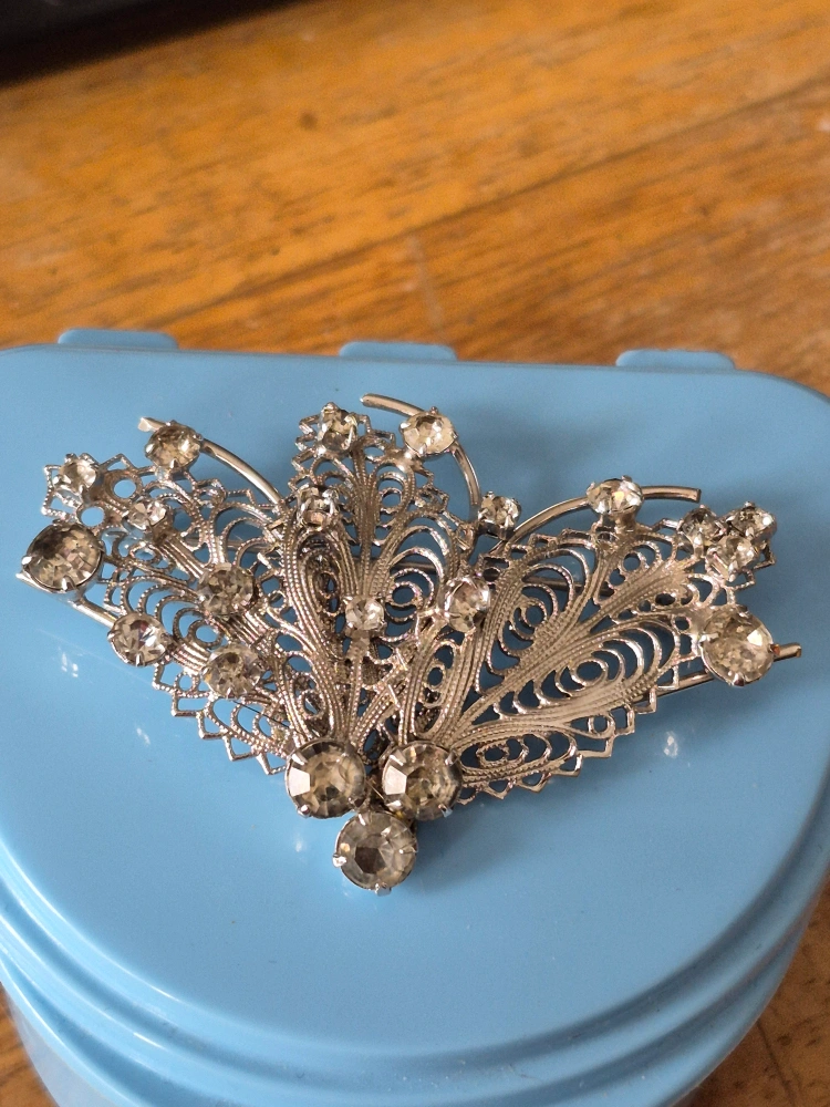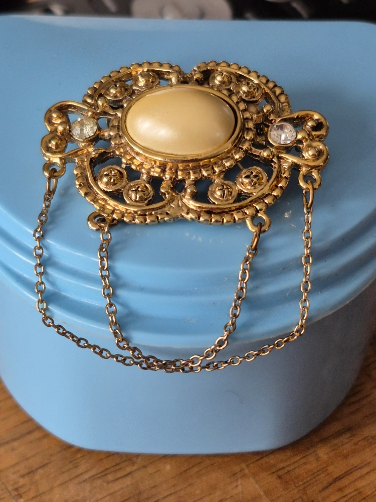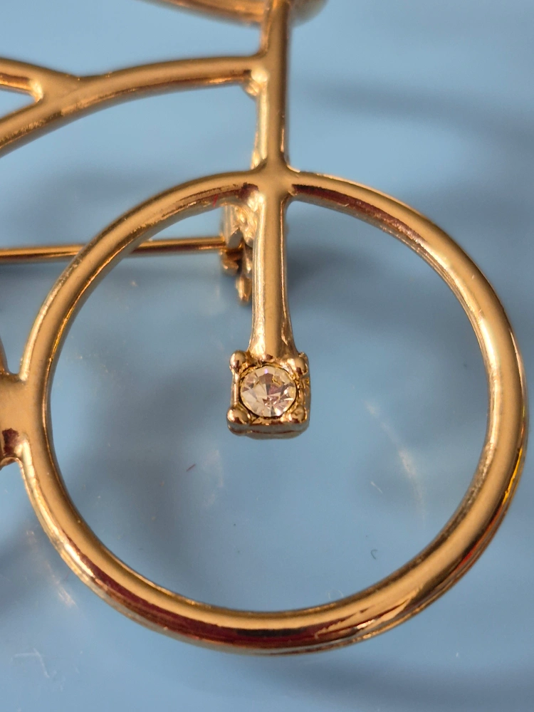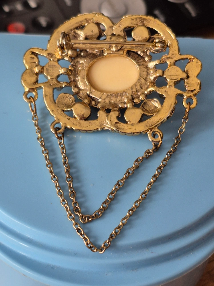 Assorted vintage brooches. Silver tone peacock design with clear stones. Gold tone cameo with dangling chains. Gold tone bicycle. gold tone leaf with color stones and with matching earrings. unique and collectible. $2.00 each. buy 1 or buy all. 1 - cameo pin - SOLD 1 - peacock pin 1 - bicycle pin 1 - leaf pin with earrings - SOLD