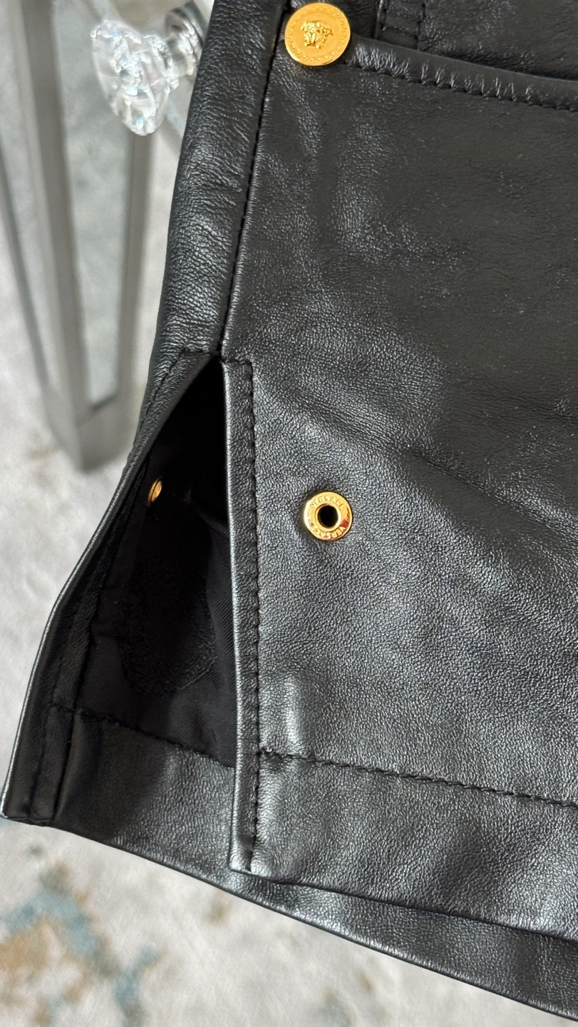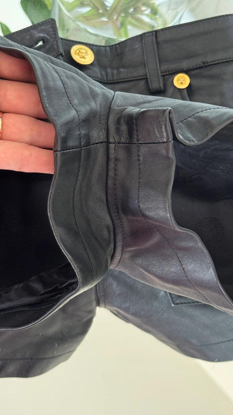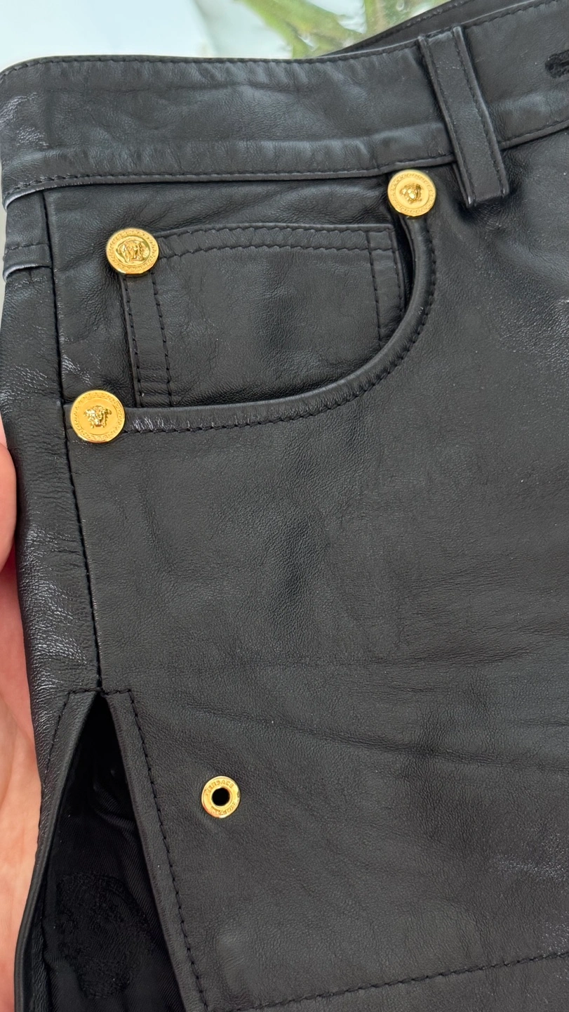 116VERSACE Leather Boxer Shorts Black Women. Authentic Size: S (36cm) Good condition 7/10 (Inside tag cut off, small tear in the zipper)