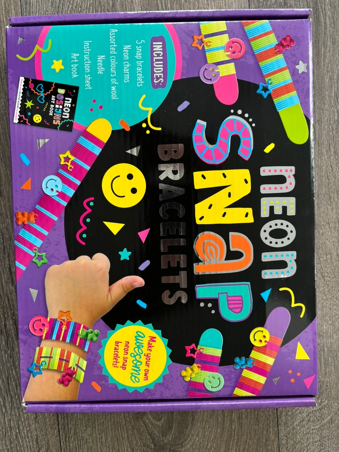 Create your own awesome neon snap bracelets. Kit includes five snap bracelets, neon charms, assorted colours of wool, needle, instruction sheet, and art book.