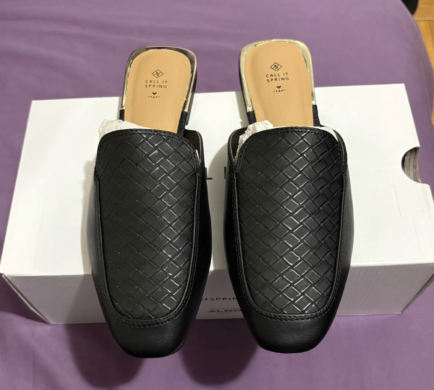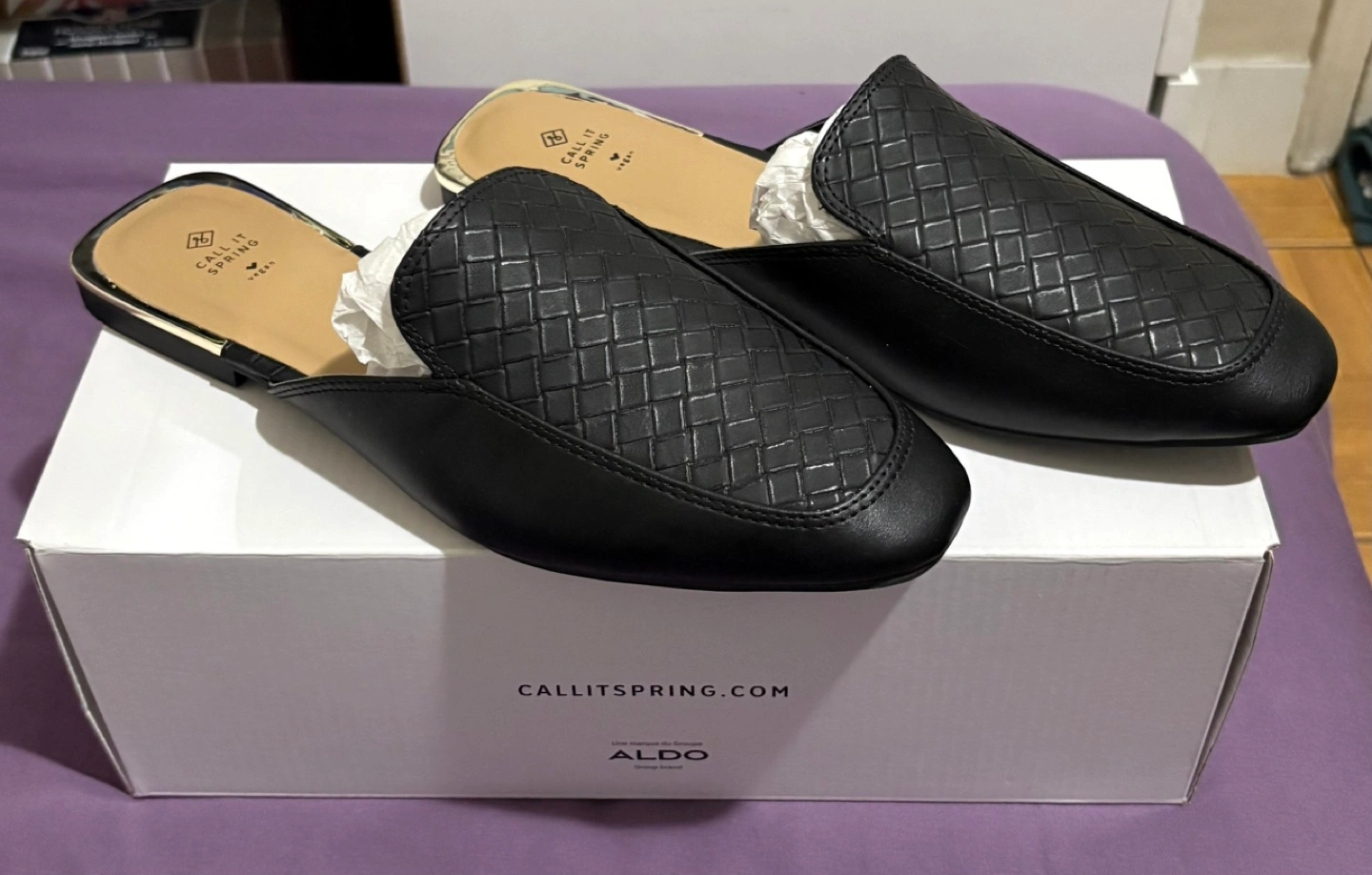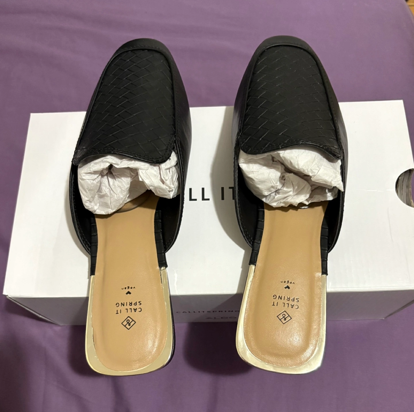677New Call It Spring Dollie mules in black. Size US 8, EURO 38.5, UK 5.5. Black woven design. Low heel. Comes in original box.
