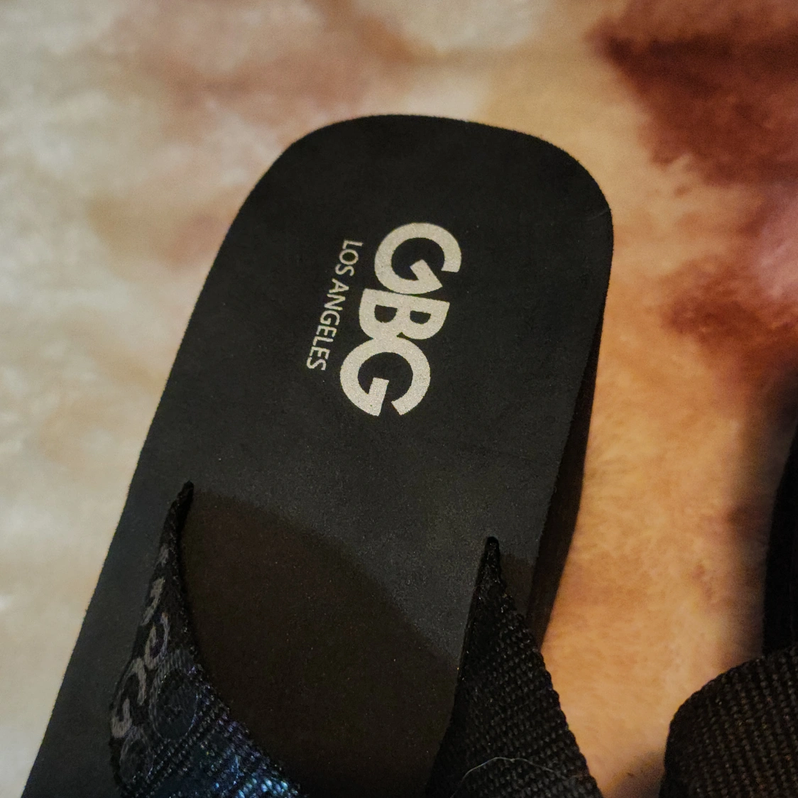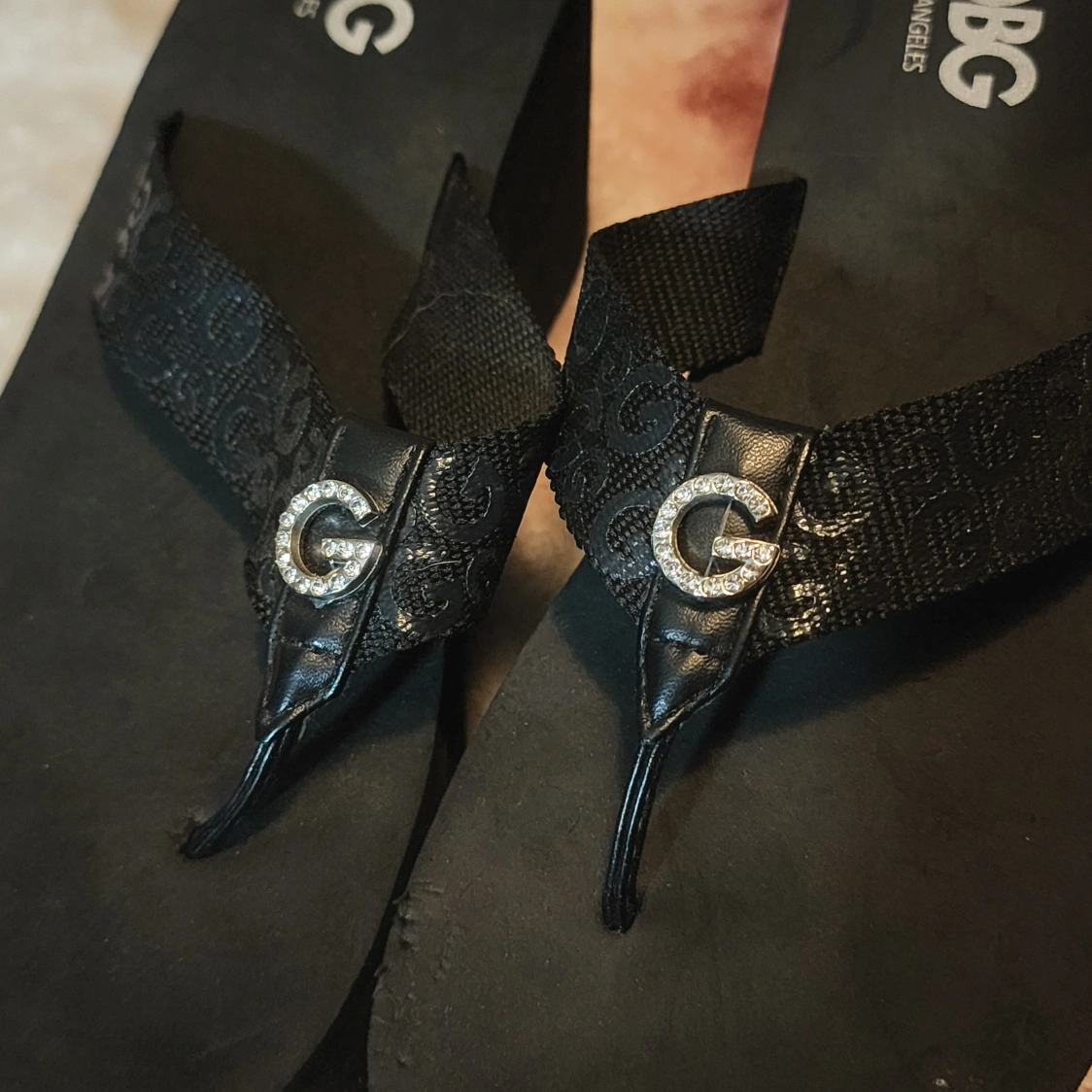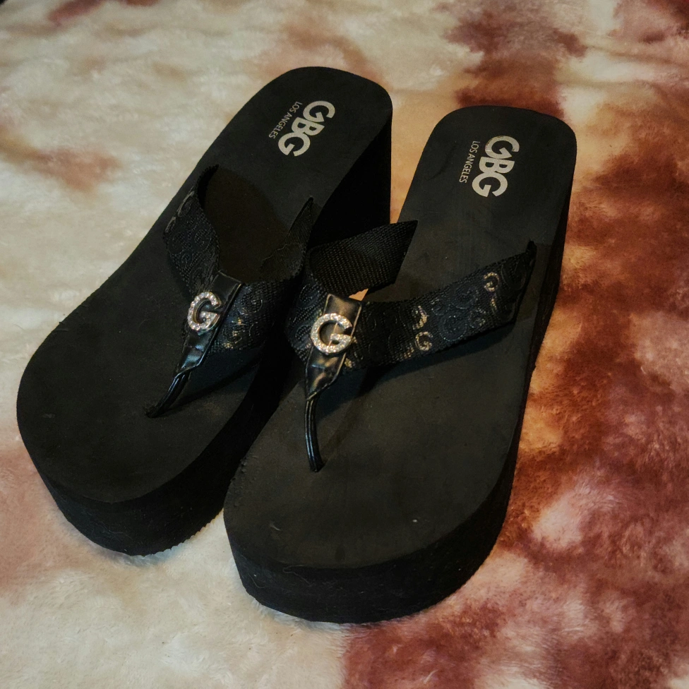 199GBG (Guess) brand platform flip flops. Black with rhinestones embellishments. Size 7 Women's. Wedge heel. Worn twice, minimal markings (cat scratch), sticker is still on the bottom. Discounted retail $40. OG retail $65.