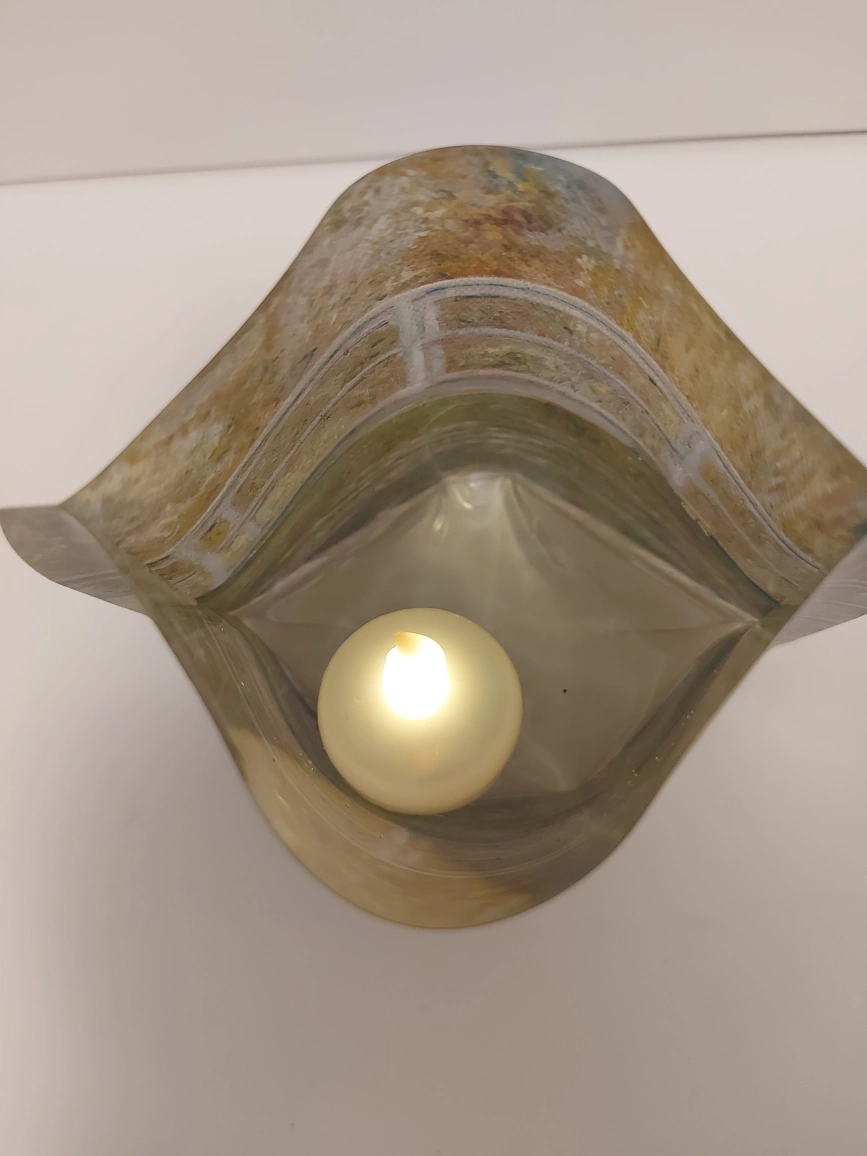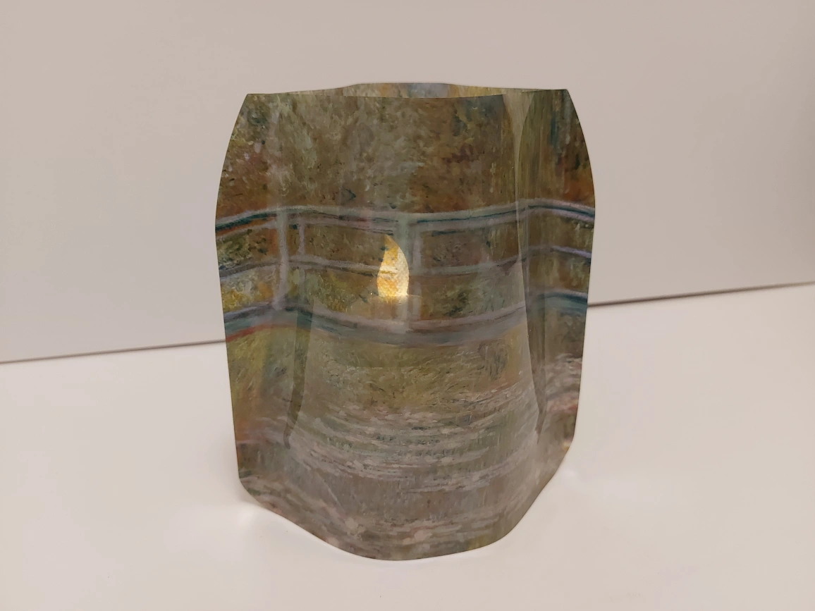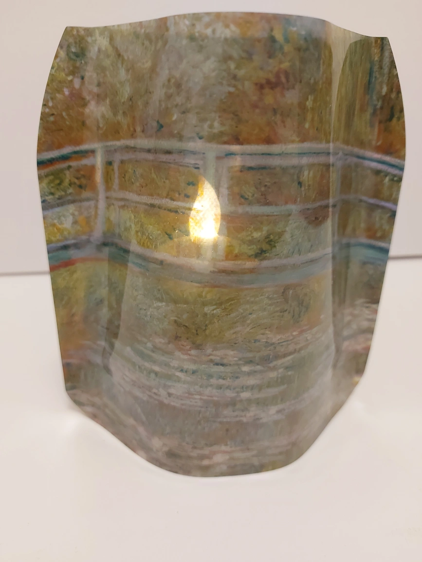 256Unique LED candle holder. Features a Bridge Over A Pond of Water Lilies by Monet. Battery-operated, includes a small LED tealight that illuminates on water. Small and portable. Great for a summer outdoor party. *water not included 😉