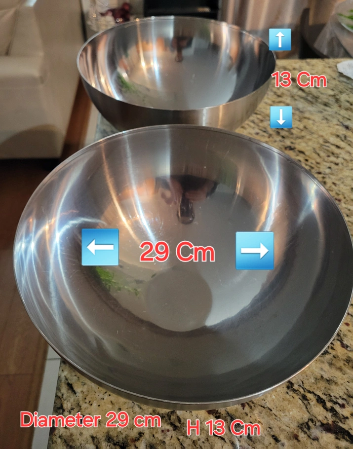 Two IKEA stainless steel mixing bowls. Larger bowl: 29 cm diameter, 13 cm high. Shiny finish. Great for mixing, serving, or storage.