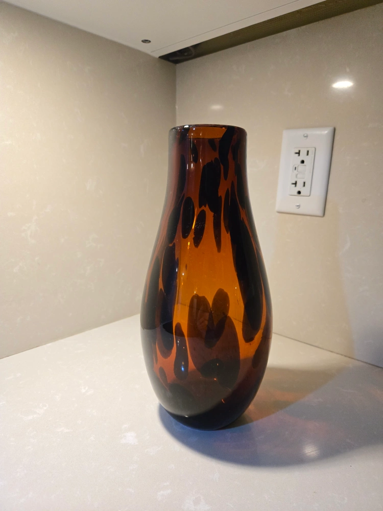 222Beautiful amber glass vase. Features black speckles throughout. Unique shape, perfect for a modern home decor style.