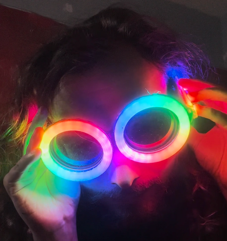 65Goggles with LED lights. Multiple colour options. Fun party accessory. Great for concerts or raves. Great for Parties or festivals fun and entertaining. Rechargeable Battery with USB C cable. Comes with Cleaning Cloth for lenses. Also comes with batteries and remote control for to customize the lighting effects and modes. Mode Effect that allows them to react to music and sounds.