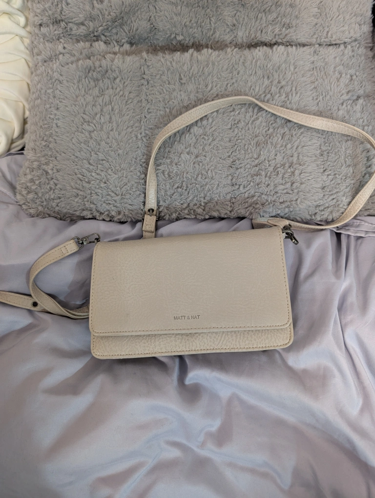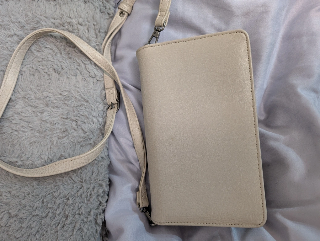 Cream-coloured crossbody bag. Features a long adjustable strap, multiple card slots and a zippered compartment. Small and compact, ideal for everyday use.