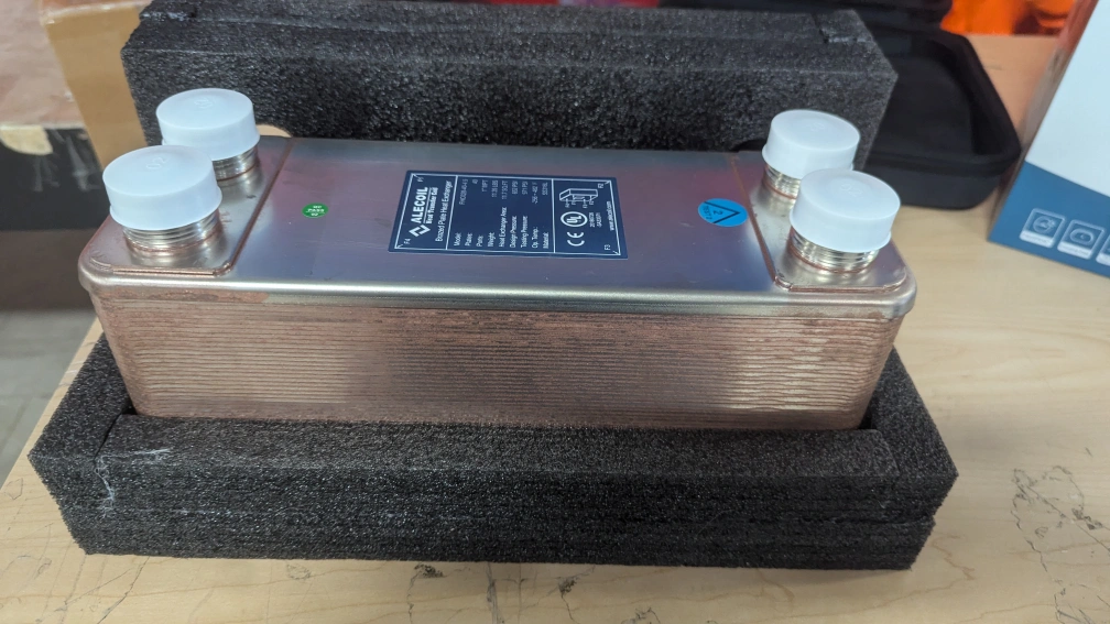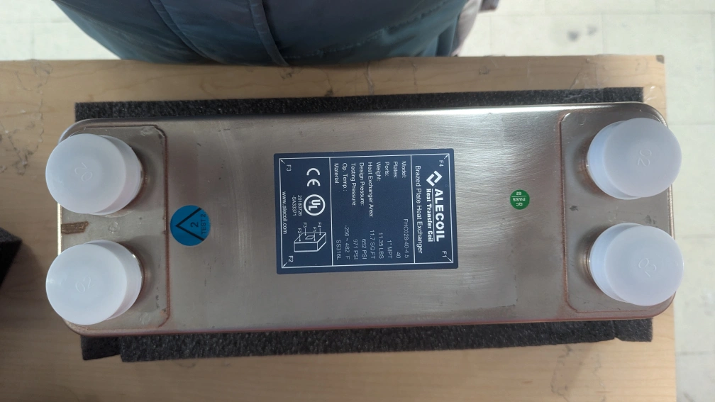 New ALEKOIL brazed plate heat exchanger. Model HC228-4-4.5. Stainless steel construction. Four ports. Includes specifications on the label. Excellent condition.