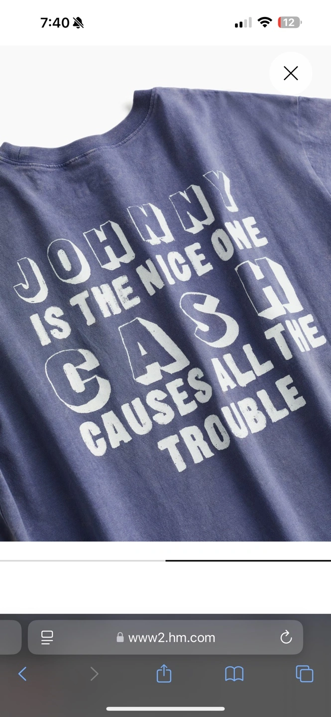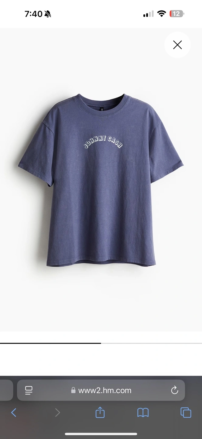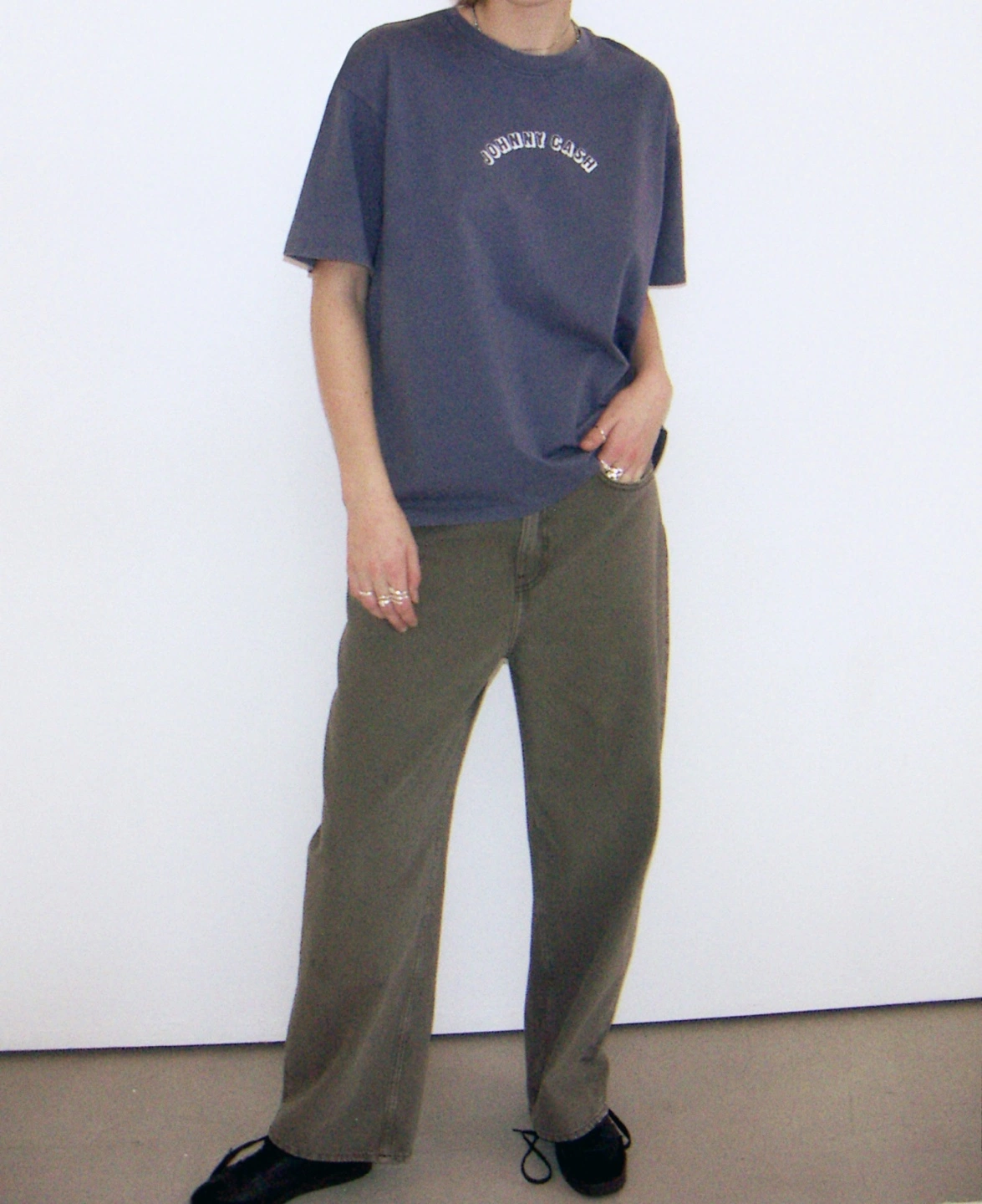 Oversized, short-sleeved, purple cotton t-shirt. Features Johnny Cash graphic on front and back. Relaxed fit.
