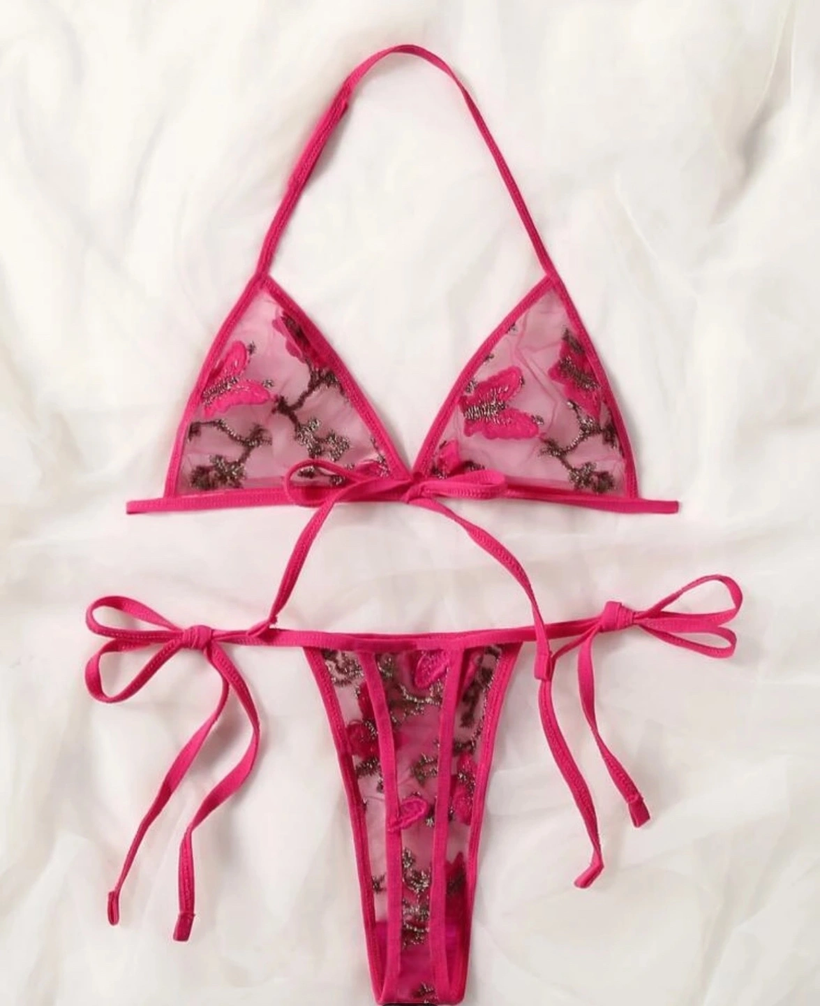 181Brand new Stunning pink lingerie set. Features delicate butterfly embroidery. Triangle top and cheeky bottom. Adjustable tie sides. Perfect for a special occasion.