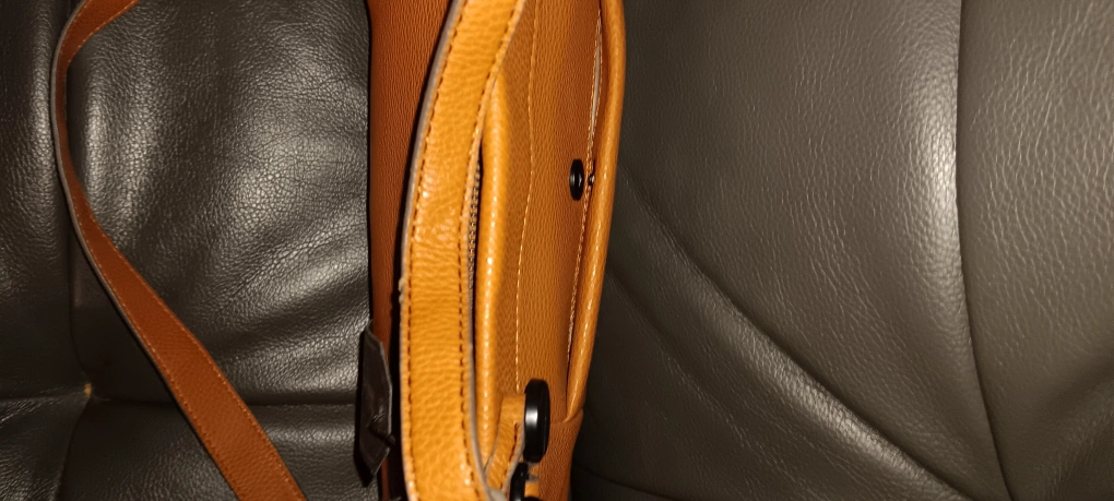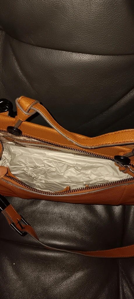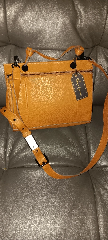 camel leather crossbody bag. Adjustable strap. medium but functional. Zipper closure. Interior pocket.