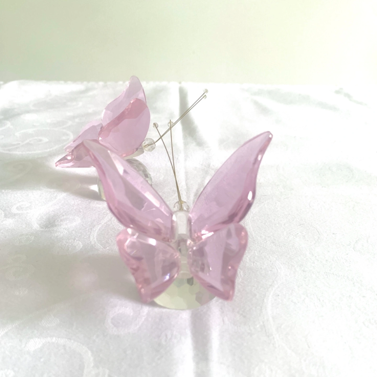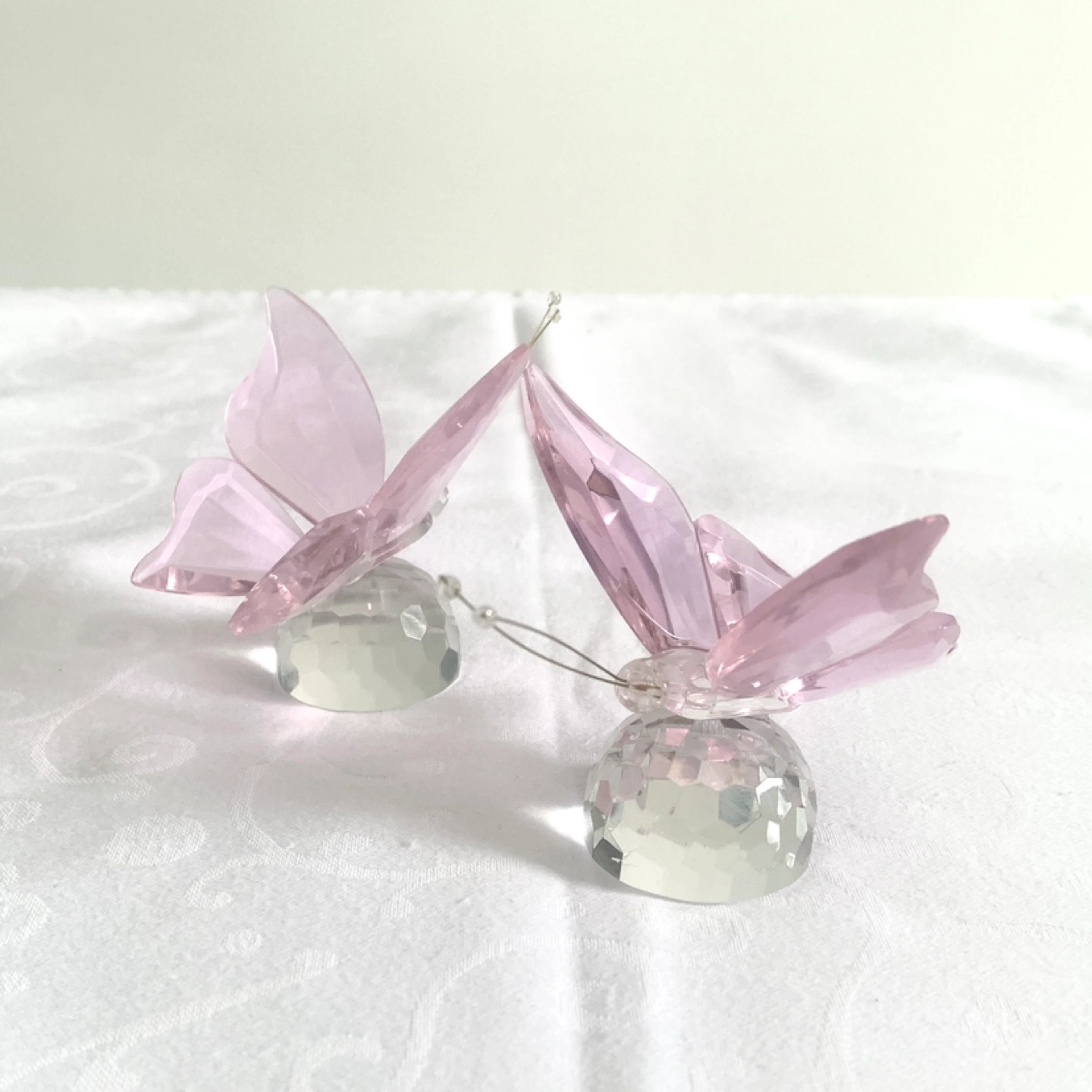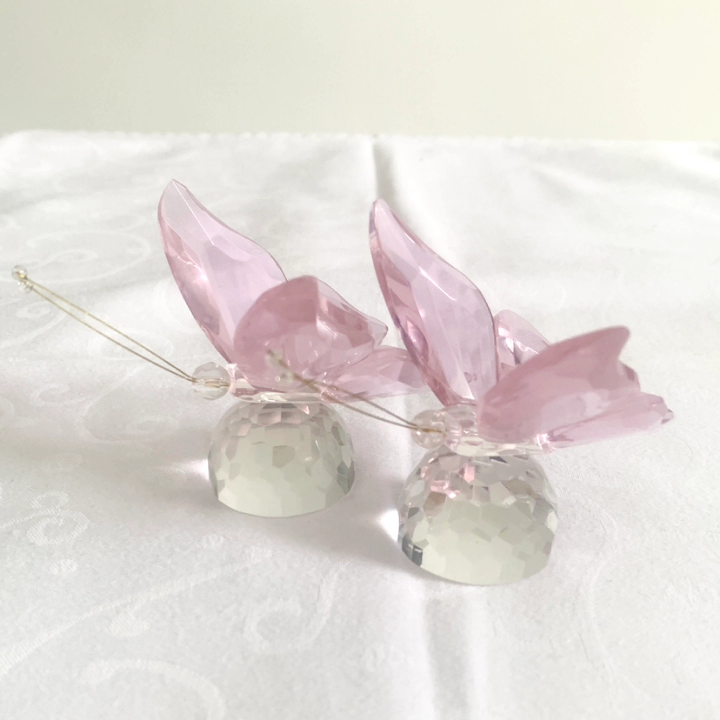 Two lovely pink crystal butterflies with wire sitting on a dome base. Accented with sculpted wings and wire antennae with tiny crystal at the tip.