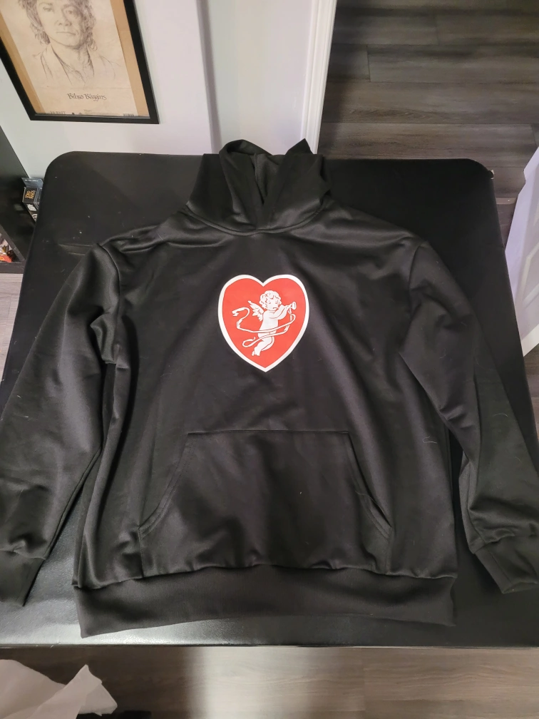 Black hooded sweatshirt. Features a red heart graphic with a cupid design. Long sleeves, kangaroo pocket.