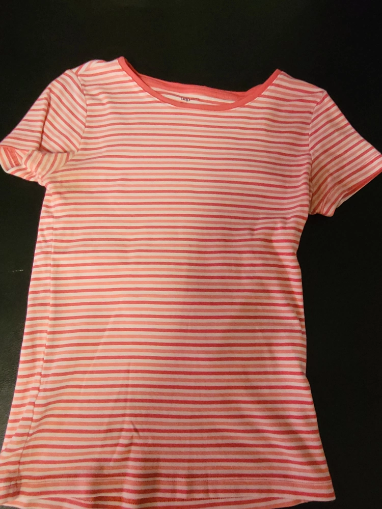 Adorable striped t-shirt. Short sleeves, crew neck. Great for summer. Pink and white horizontal stripes.