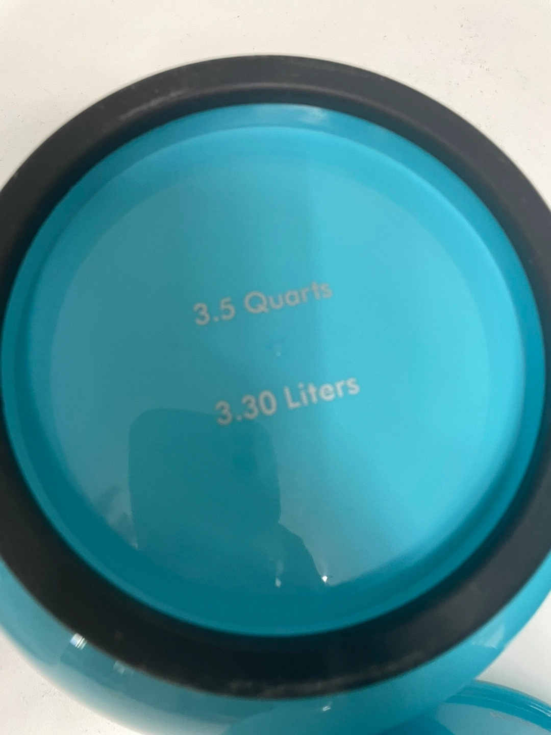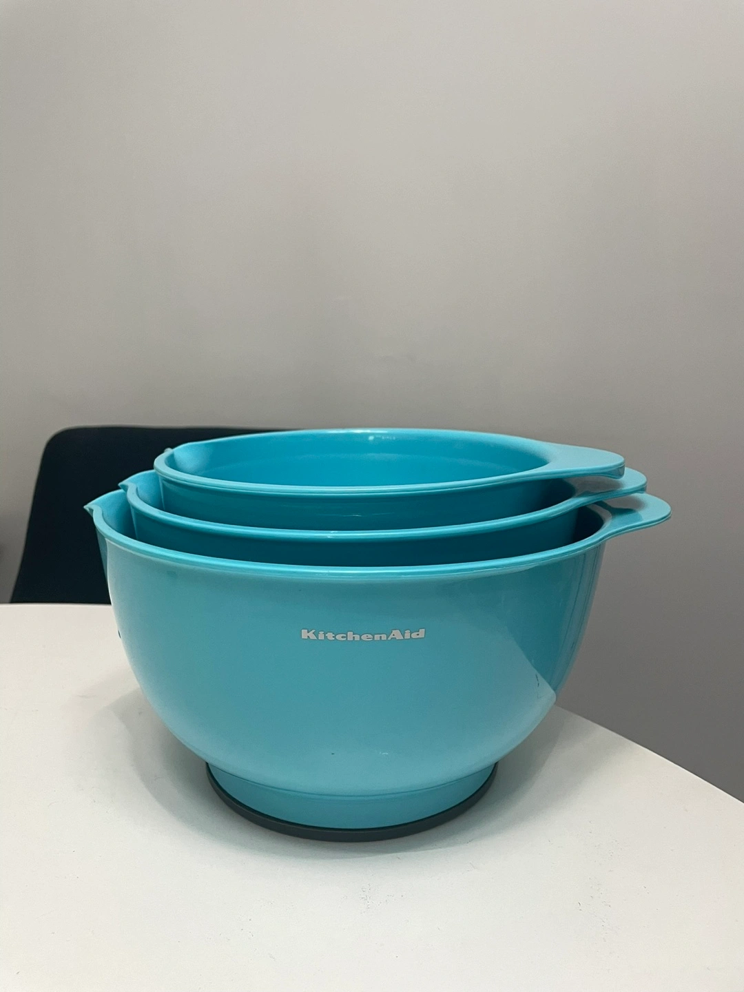 363Barely used, good condition Kitchen Aid mixing bowls. Set of 3. Colour: Aqua Sky