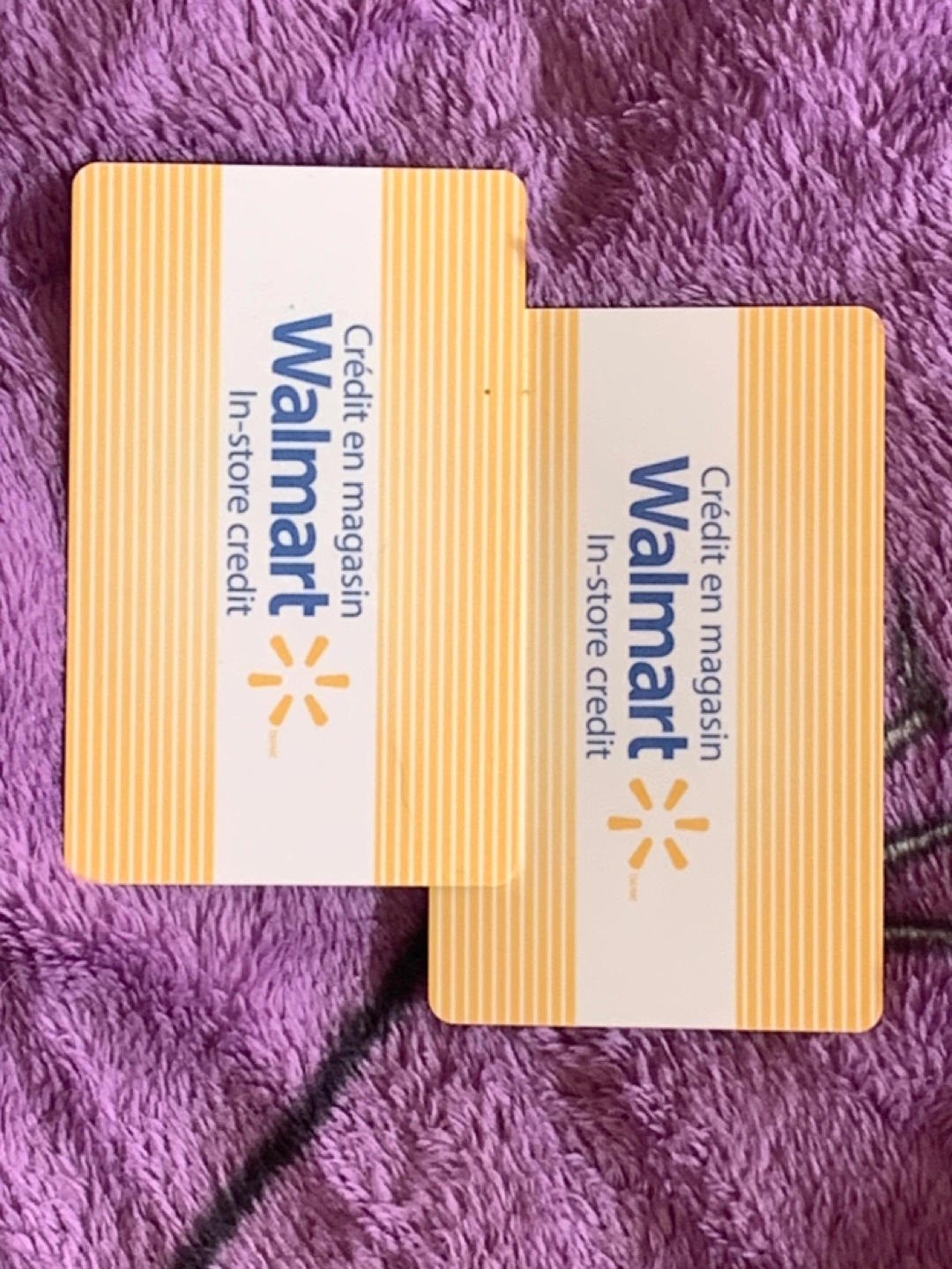 Two unused $10 Walmart in-store credit gift cards. Scratch-off PINs are covered. Valid at any participating Canadian Walmart location.