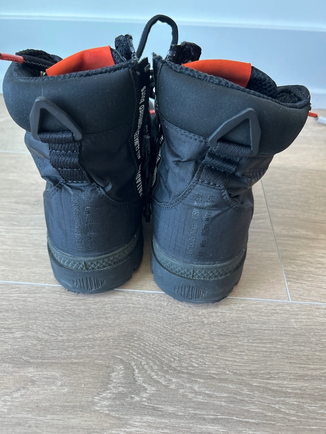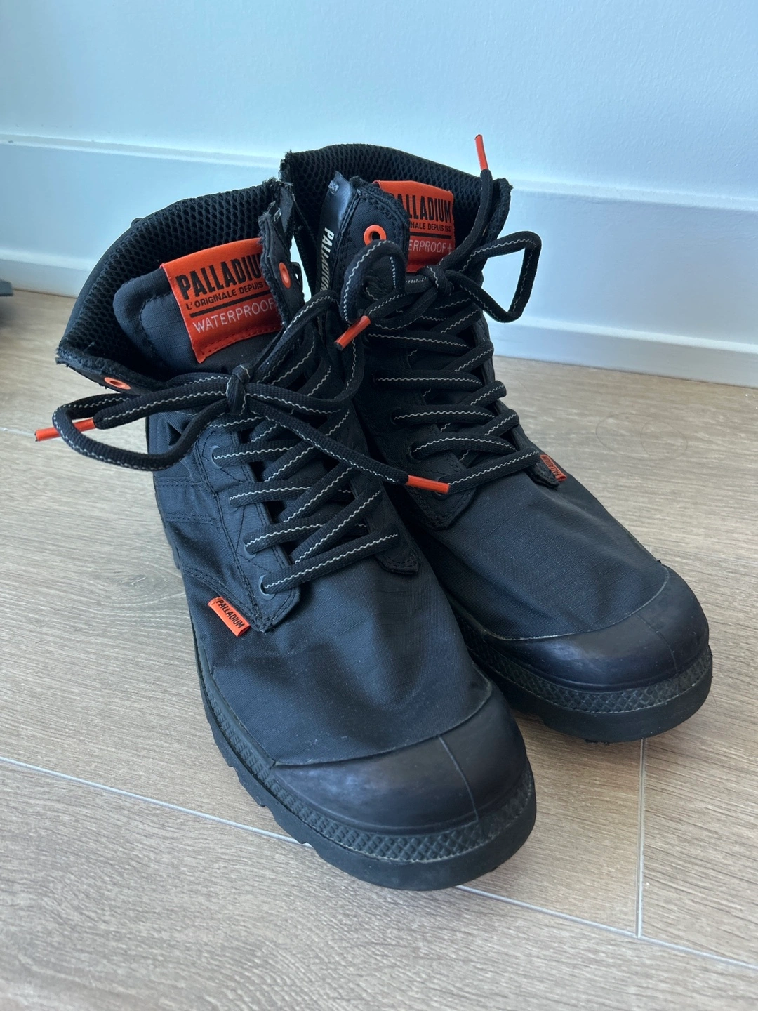 Black Palladium boots. Waterproof. Size 8. High-top style. Orange accents. Lace-up closure.