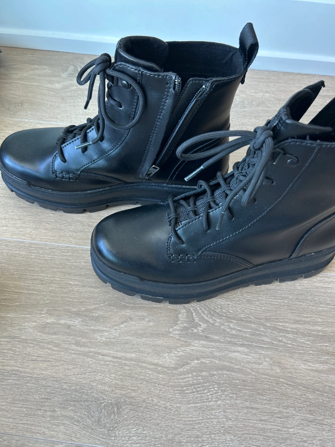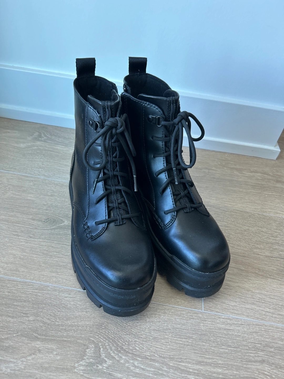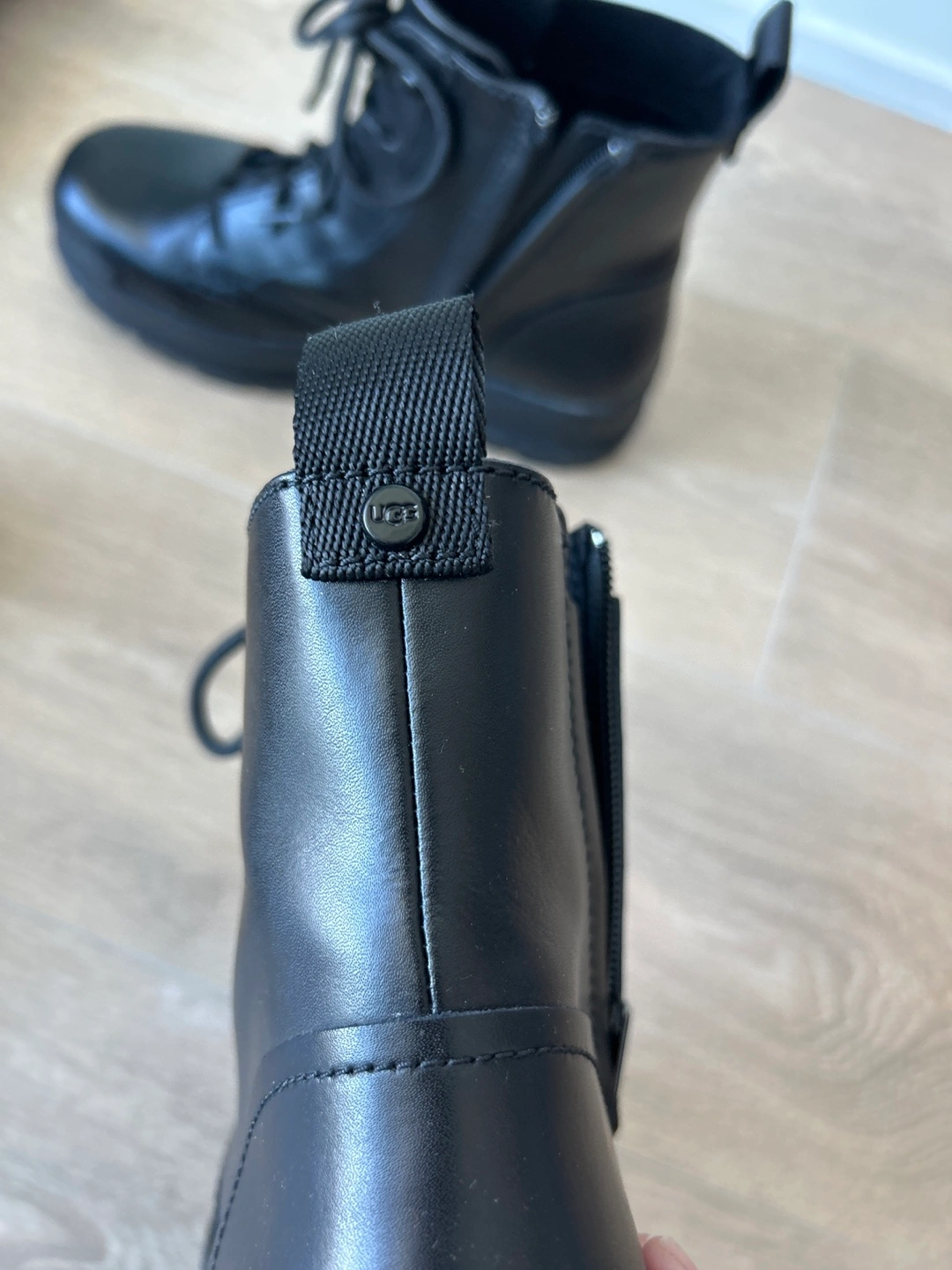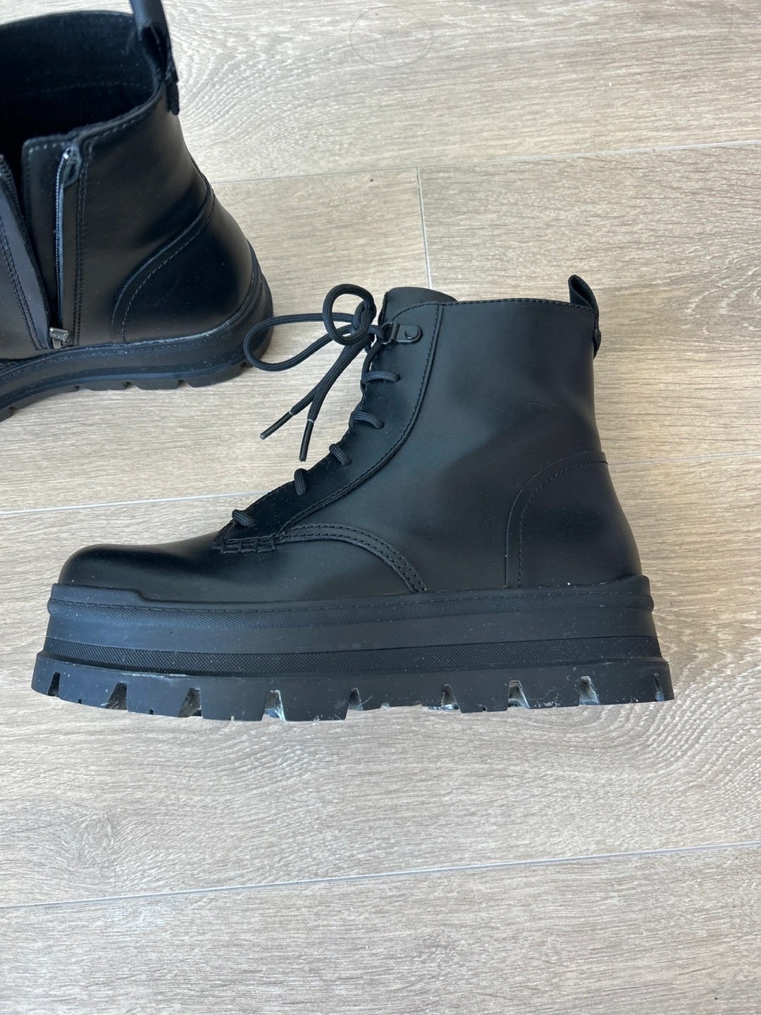 Black leather UGG boots. Lace-up style with side zipper. Chunky platform sole. Excellent condition.