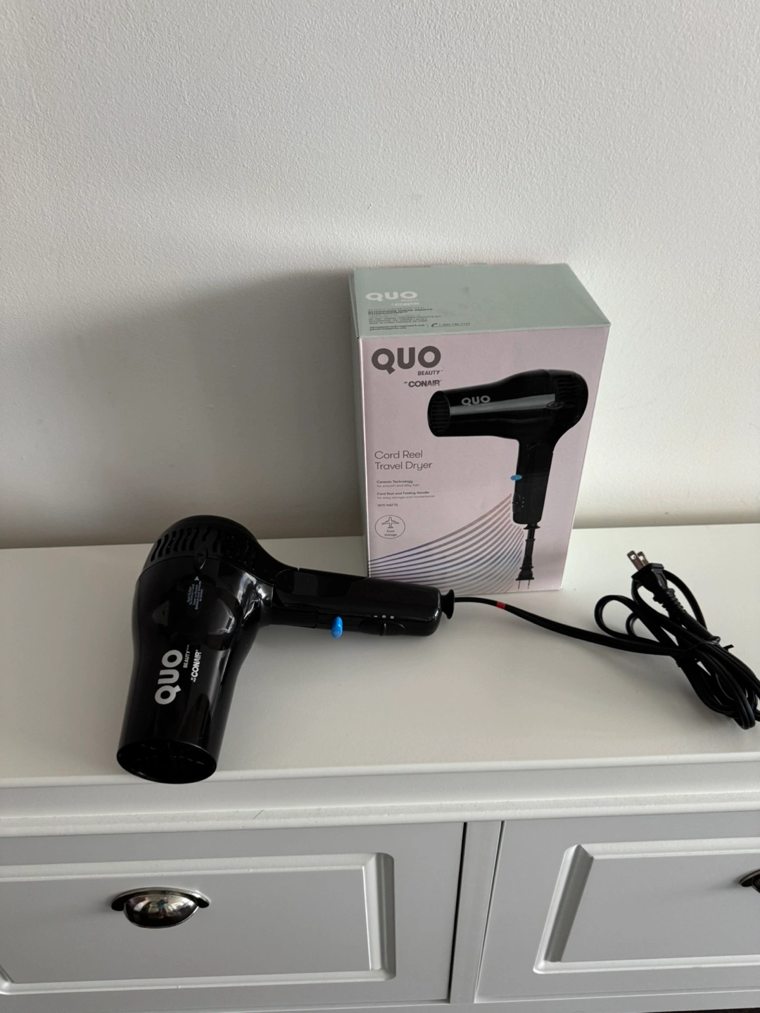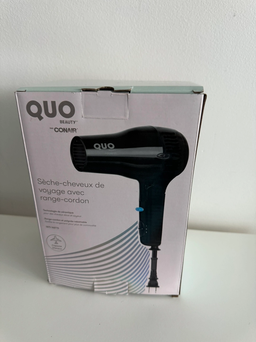 Compact travel hairdryer. Features ceramic technology, cord reel and folding handle. 1200 watts. Black. This is like new, this was only bought for our guest to use for less than a month. You can also check the price at Shopper’s Drug Mart where it was bought. Pick up at Bathurst & Steeles area.