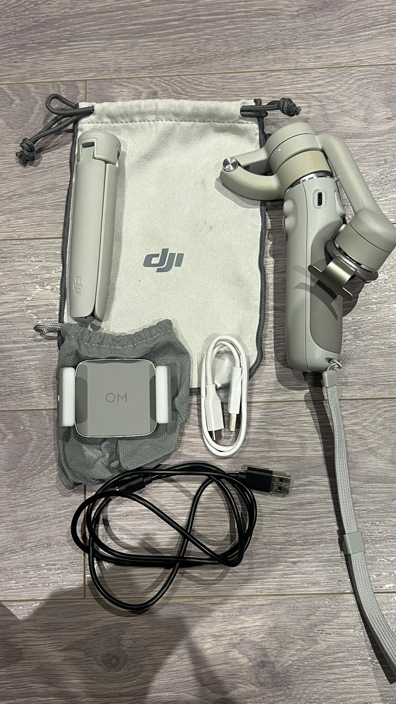 Grey DJI OM 5 gimbal, includes carrying case, tripod, phone clamp, and charging cables. Excellent for smooth videos.