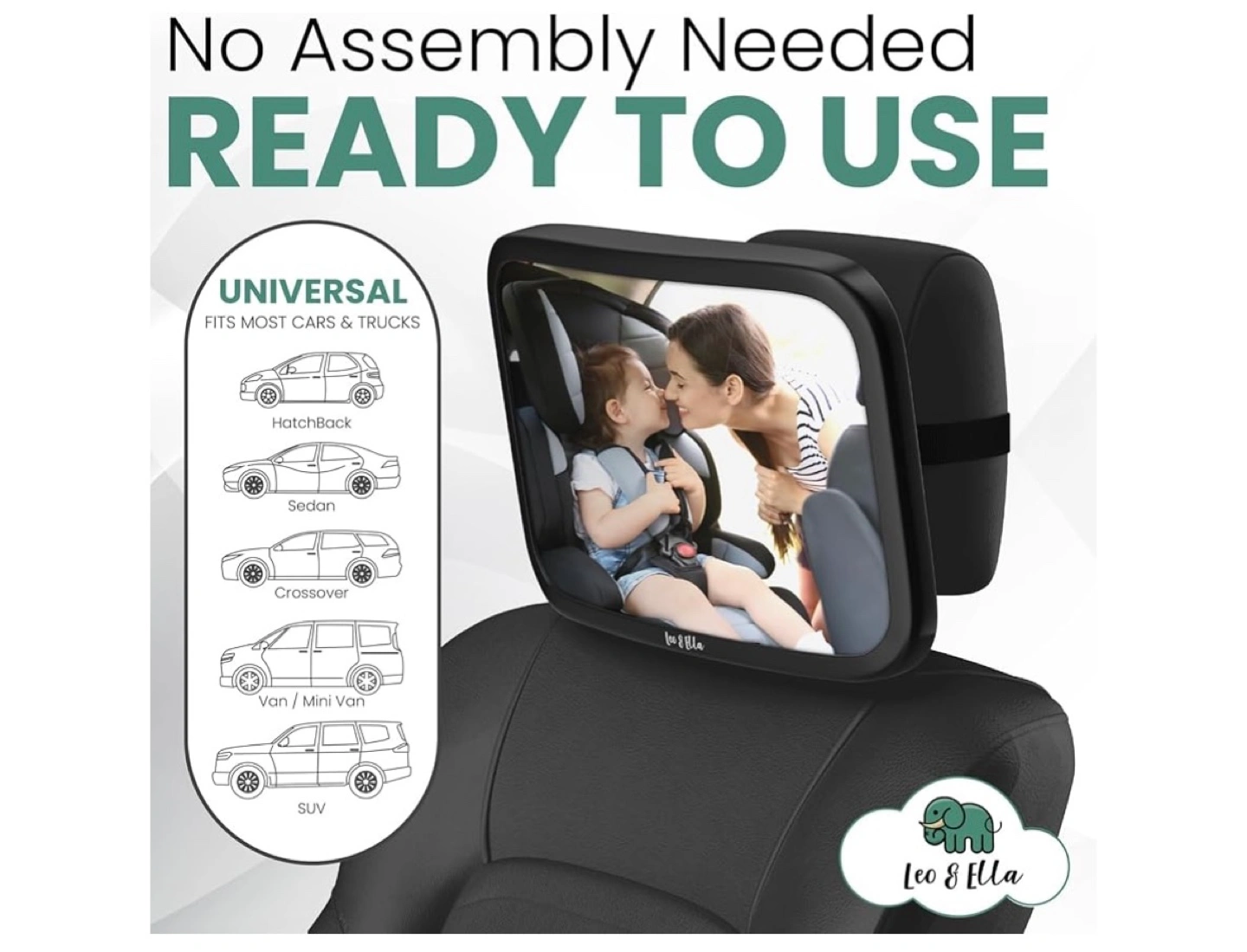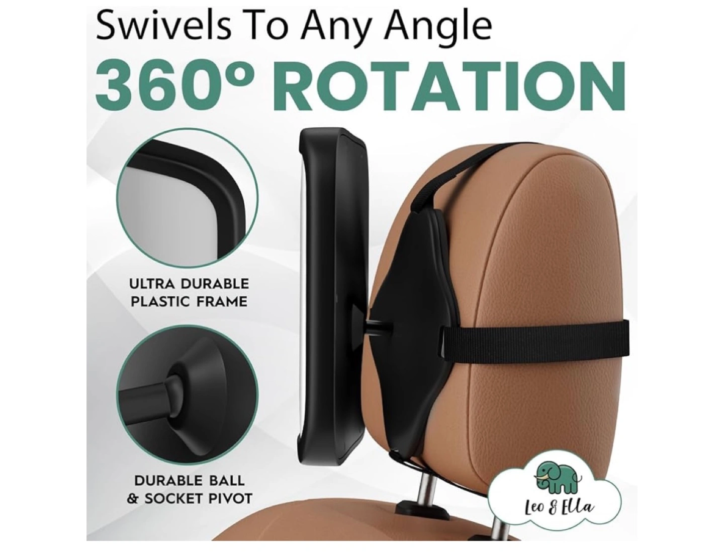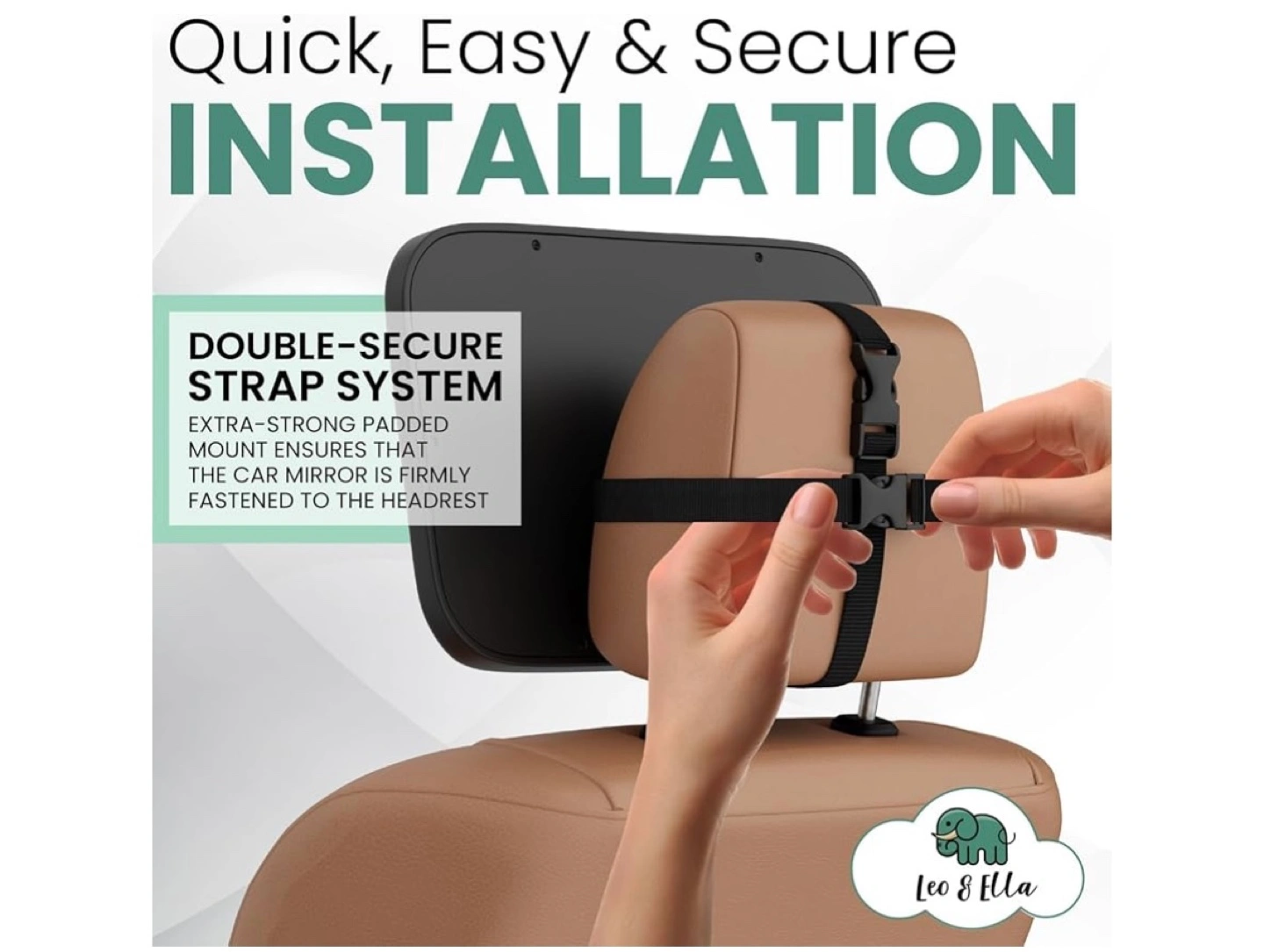 Very good condition. Drive with Baby in Sight - Drive with peace of mind knowing your baby is safe in the back. Leo & Ella’s rear-facing car mirror for baby features a larger convex and fully rotational design. It can be rotated 360°, and it gives a clear view of your infant from any angle. Made Safe for Baby - The design of our baby car mirrors follows safety measures for your little passenger. Each backseat mirror is made heat-resistant and smooth on the surface. Exceptional Quality - This baby car mirror uses ABS shatterproof acrylic glass with a thick matte border and a double-secure strap system. The extra-strong padded mount ensures that the car mirror is firmly fastened to the headrest, keeping your baby safe during the ride. No Assembly Needed - Our baby car seat mirror offers a quick and easy installation in under 30 seconds. Each car seat mirror comes fully assembled and ready to use, ideal for parents who are always on-the-go. Just tie and adjust the straps to secure the car mirror, and you’re all set! Safety-Tested - Unlike substandard baby car accessories that pose a danger to your child, this baby mirror is safe and functional for daily commutes and long drives. Our baby essentials are crafted and inspected to ensure the highest levels of safety in case of a crash.