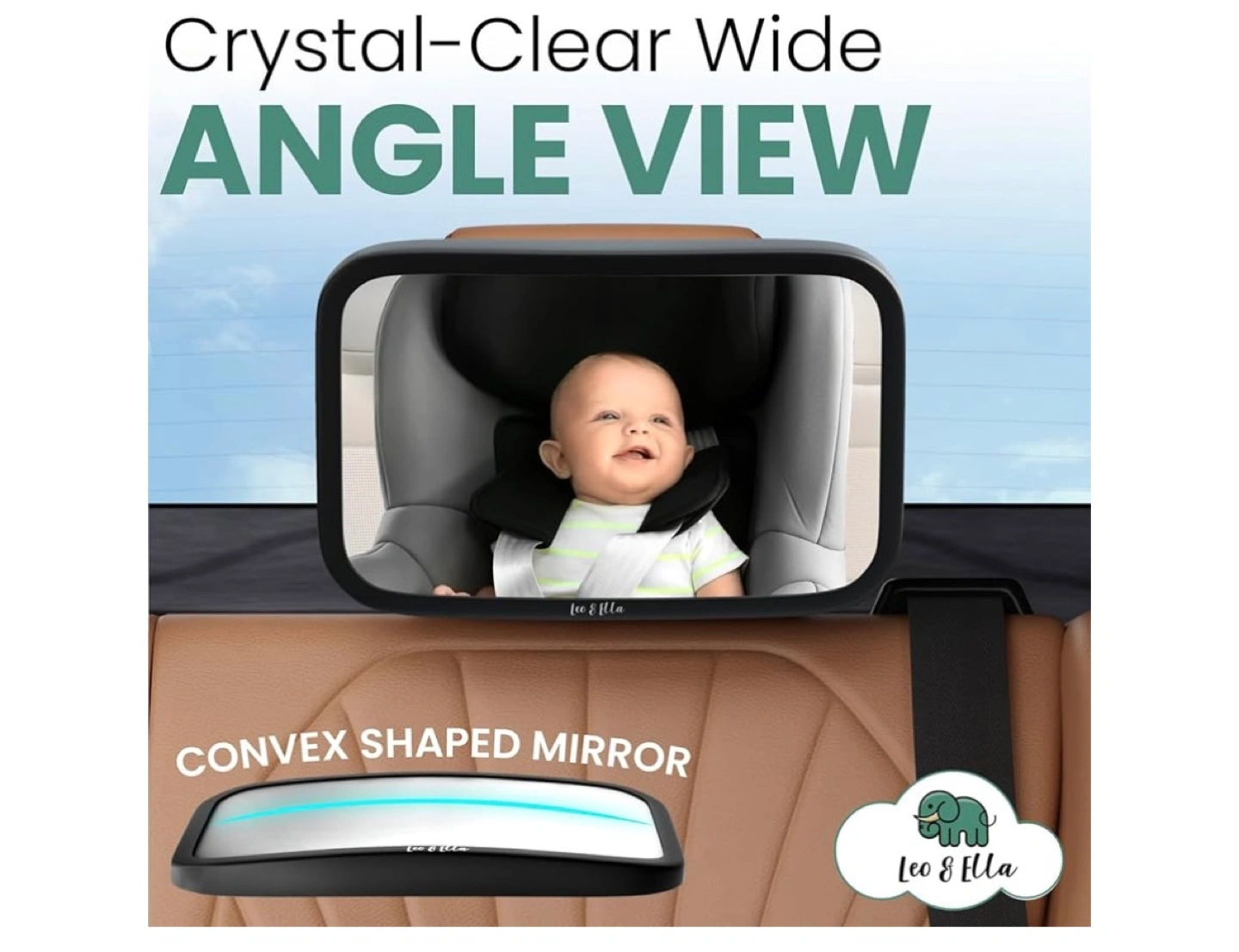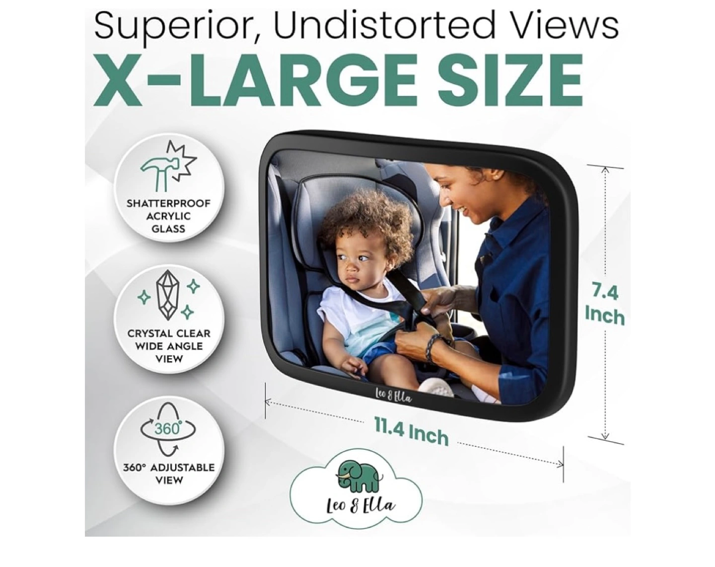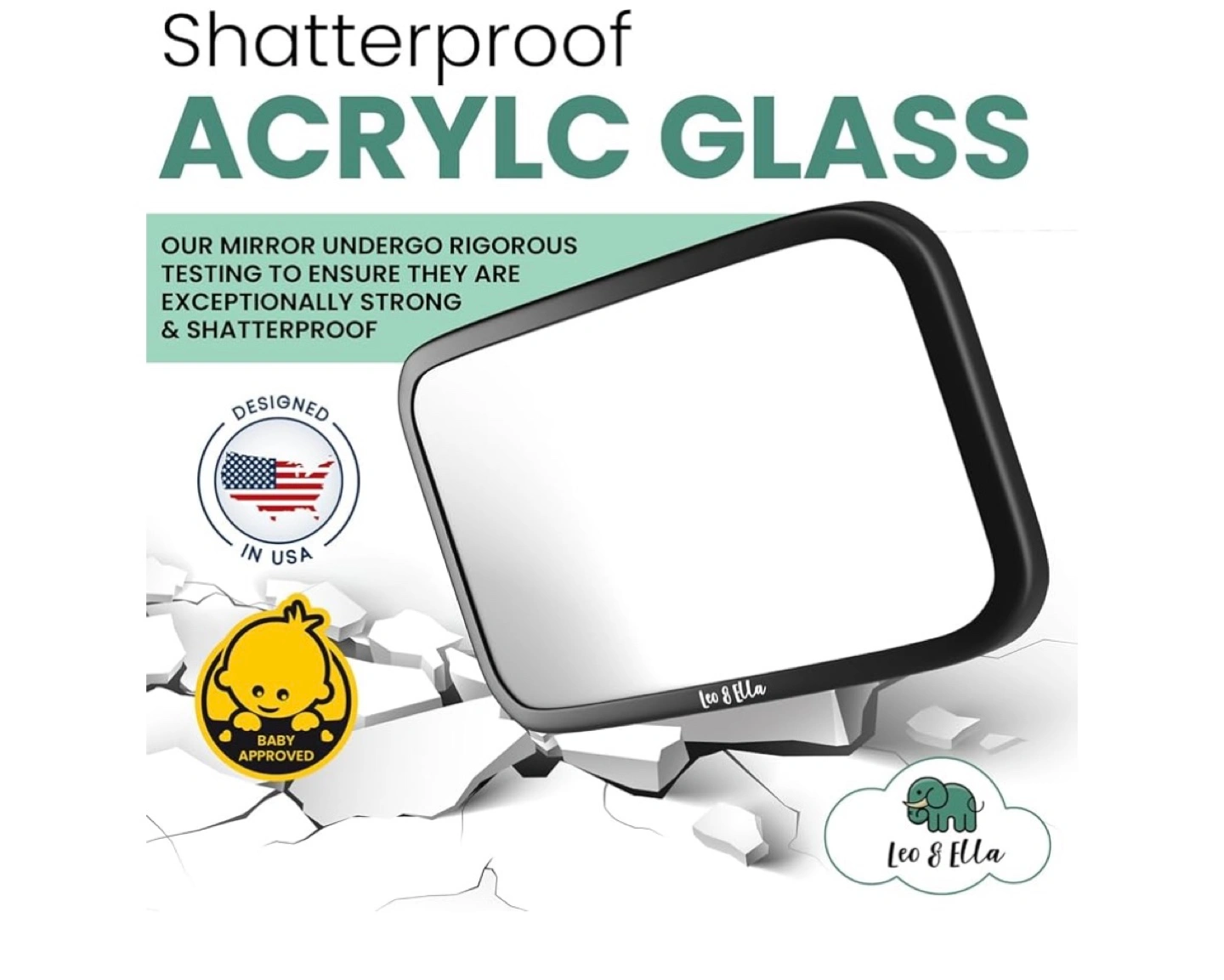Very good condition. Drive with Baby in Sight - Drive with peace of mind knowing your baby is safe in the back. Leo & Ella’s rear-facing car mirror for baby features a larger convex and fully rotational design. It can be rotated 360°, and it gives a clear view of your infant from any angle. Made Safe for Baby - The design of our baby car mirrors follows safety measures for your little passenger. Each backseat mirror is made heat-resistant and smooth on the surface. Exceptional Quality - This baby car mirror uses ABS shatterproof acrylic glass with a thick matte border and a double-secure strap system. The extra-strong padded mount ensures that the car mirror is firmly fastened to the headrest, keeping your baby safe during the ride. No Assembly Needed - Our baby car seat mirror offers a quick and easy installation in under 30 seconds. Each car seat mirror comes fully assembled and ready to use, ideal for parents who are always on-the-go. Just tie and adjust the straps to secure the car mirror, and you’re all set! Safety-Tested - Unlike substandard baby car accessories that pose a danger to your child, this baby mirror is safe and functional for daily commutes and long drives. Our baby essentials are crafted and inspected to ensure the highest levels of safety in case of a crash.