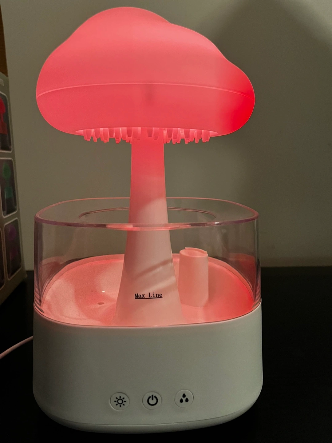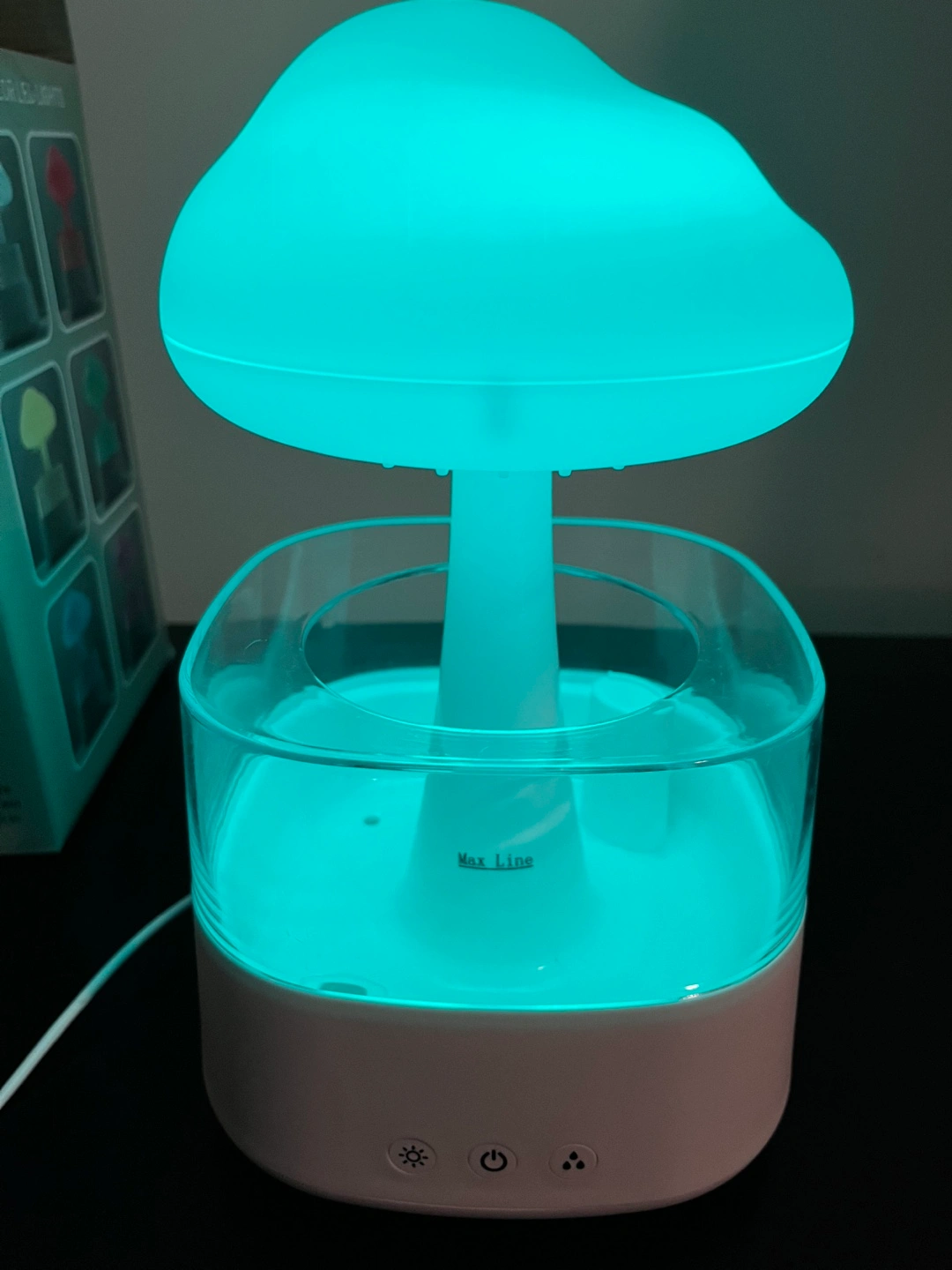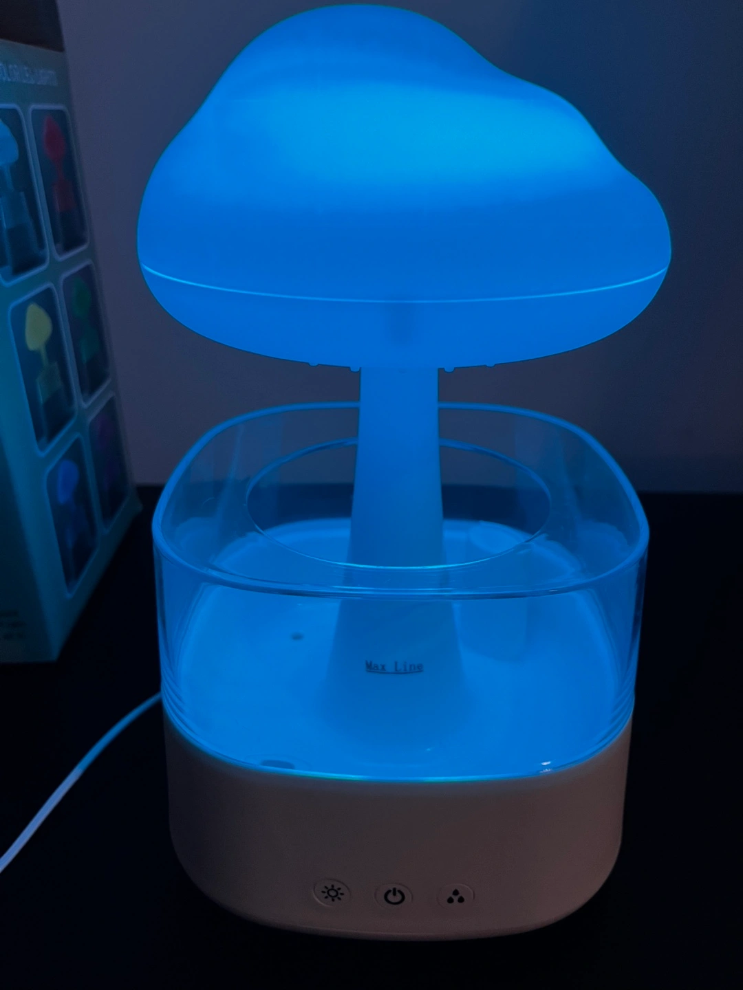 Mushroom-shaped lamp with multicolor LED lights. Features misting and rain drop effects. USB powered. Multiple light settings.