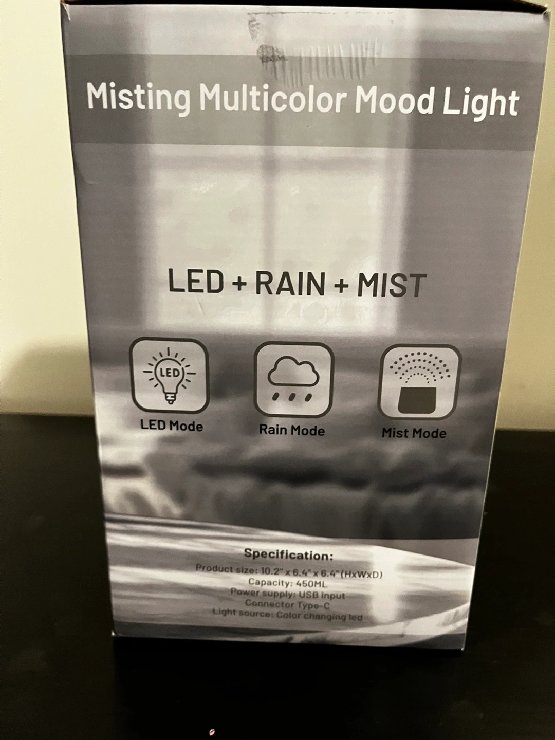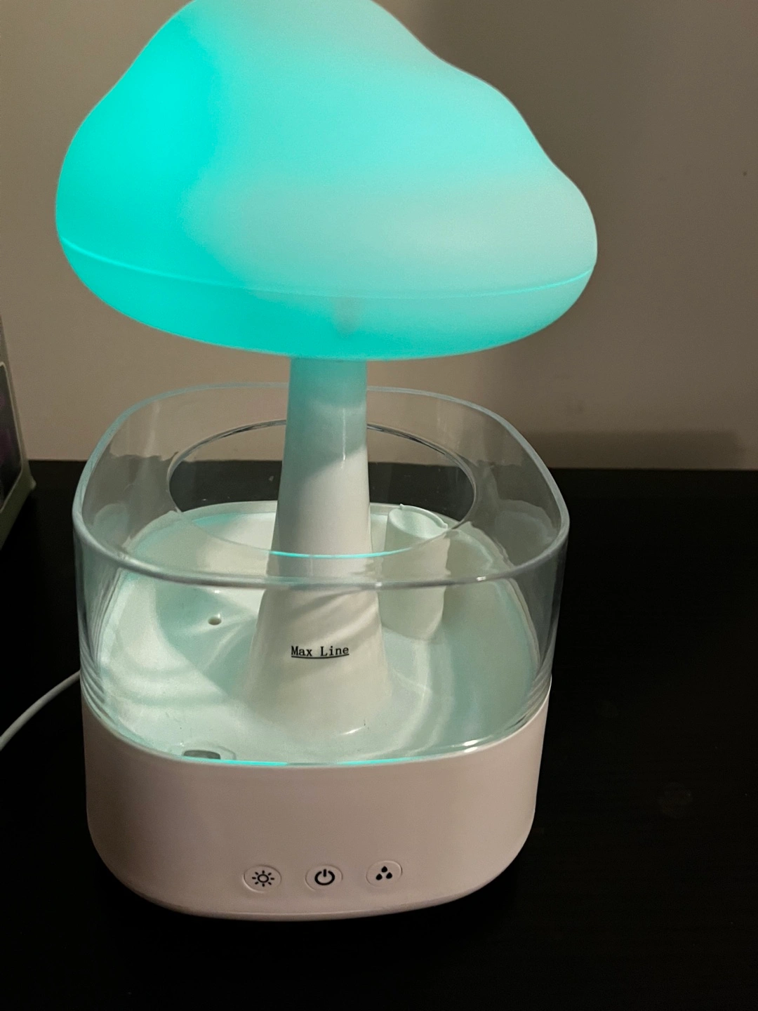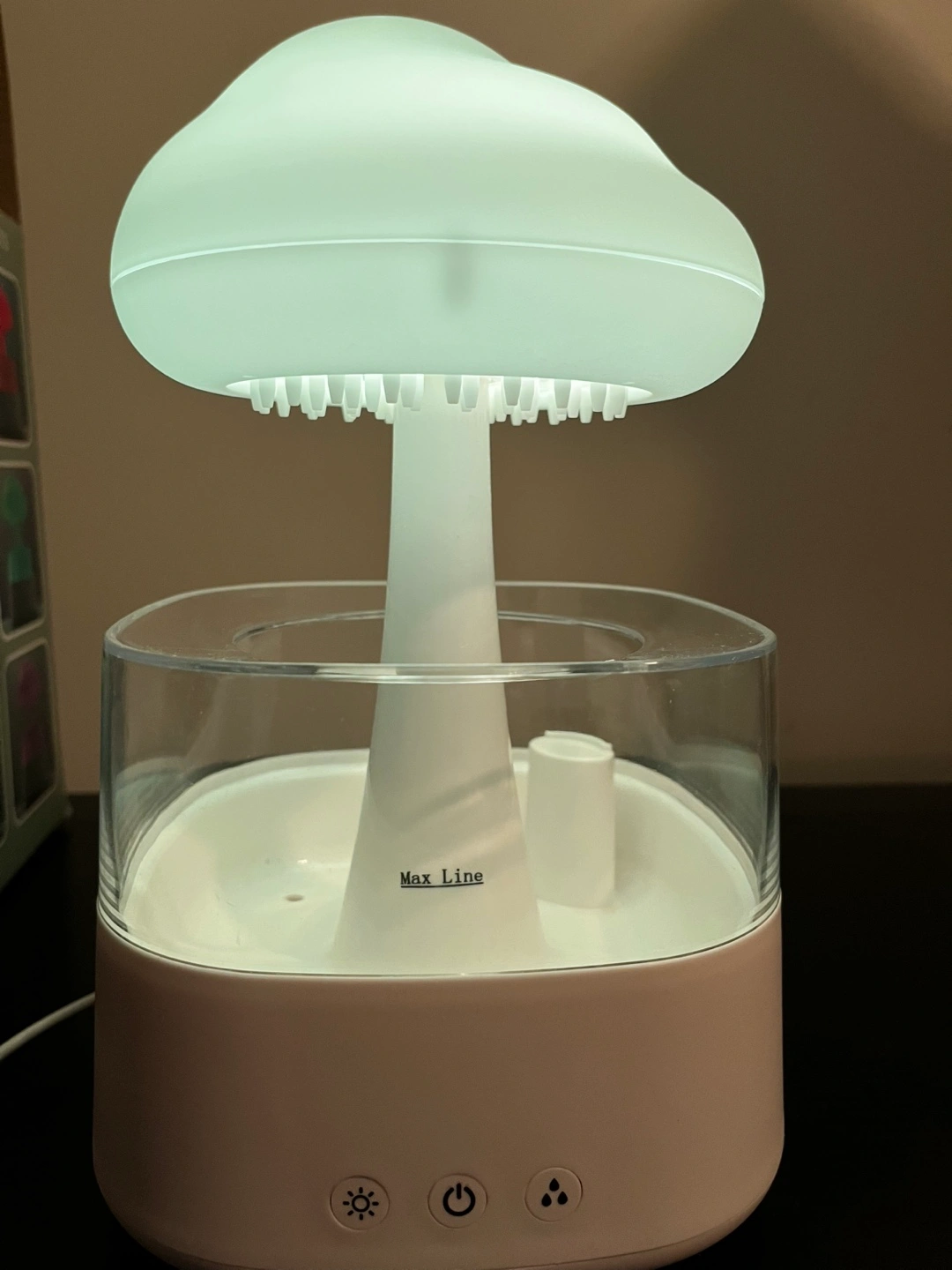 Mushroom-shaped lamp with multicolor LED lights. Features misting and rain drop effects. USB powered. Multiple light settings.