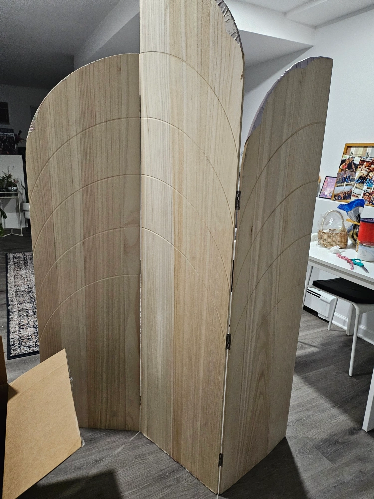 Free standing room divider. Three panels, light wood finish. Arched top design. Good for adding privacy or creating zones in a room. Can be backdrop for weddings.