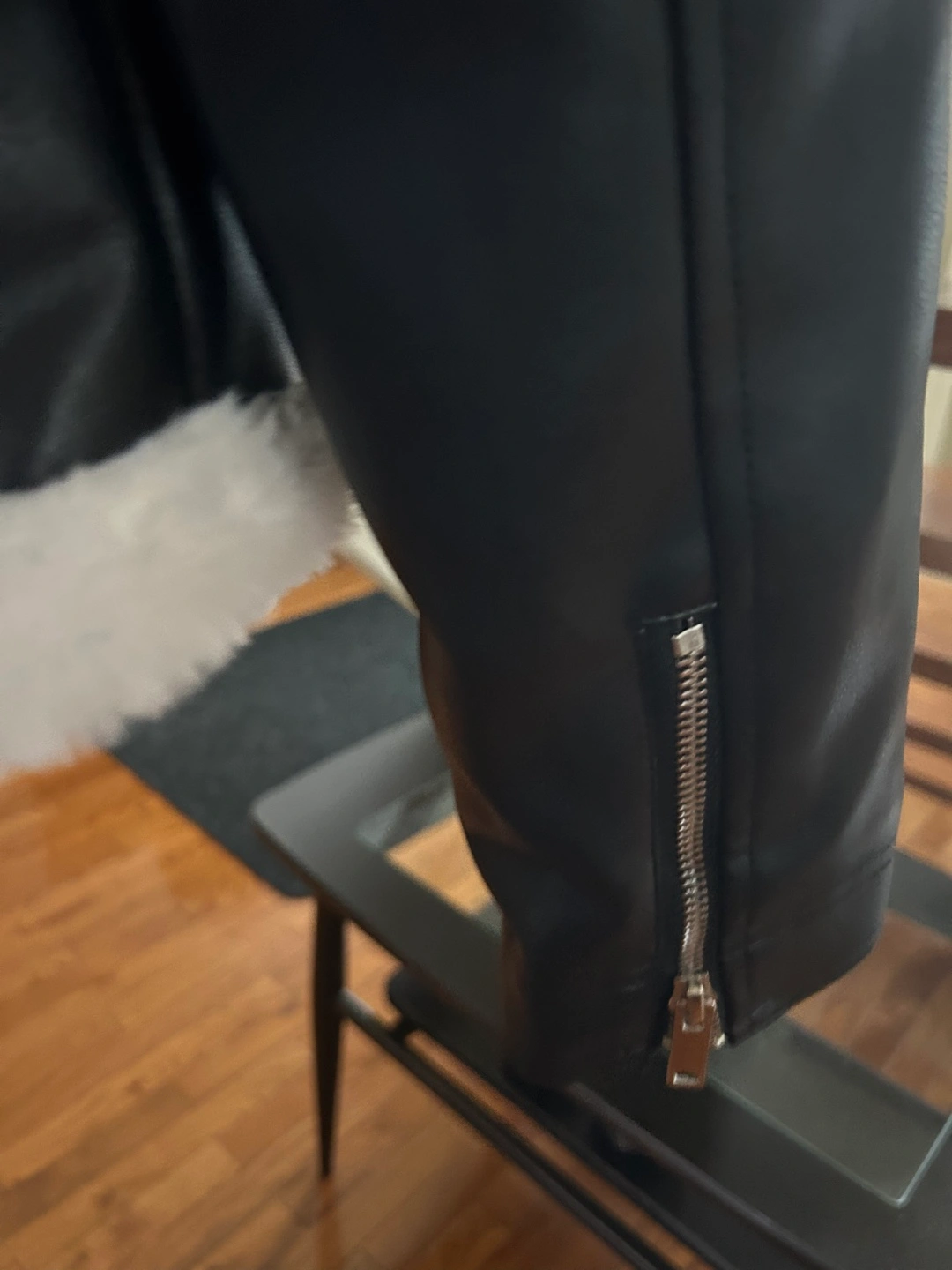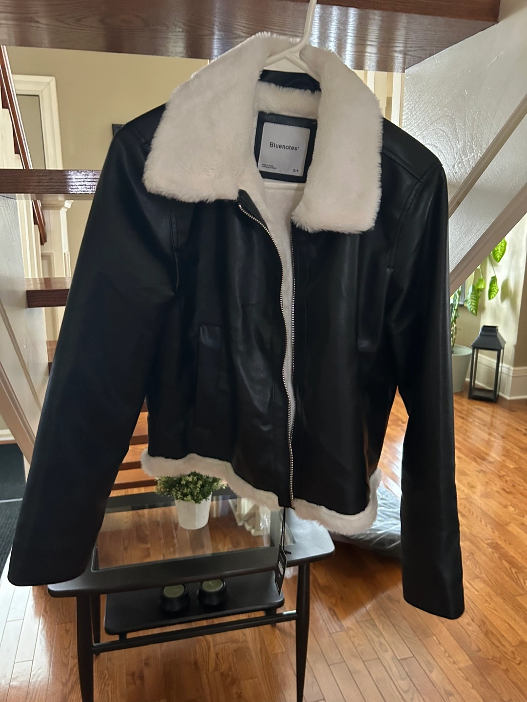 Women's black faux leather jacket. Features a white faux fur collar and hem. Zip closure. Size small. Paid 60$ plus tax
