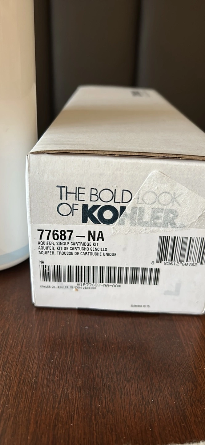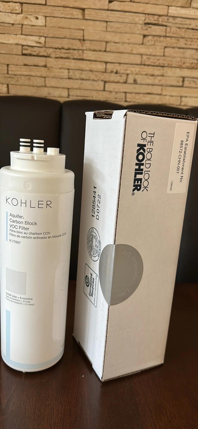 New, unopened Kohler Aquifer single cartridge water filter. Carbon block, VOC filter. Replaces 77687-NA. Part number 1285441. 8-month filter life.