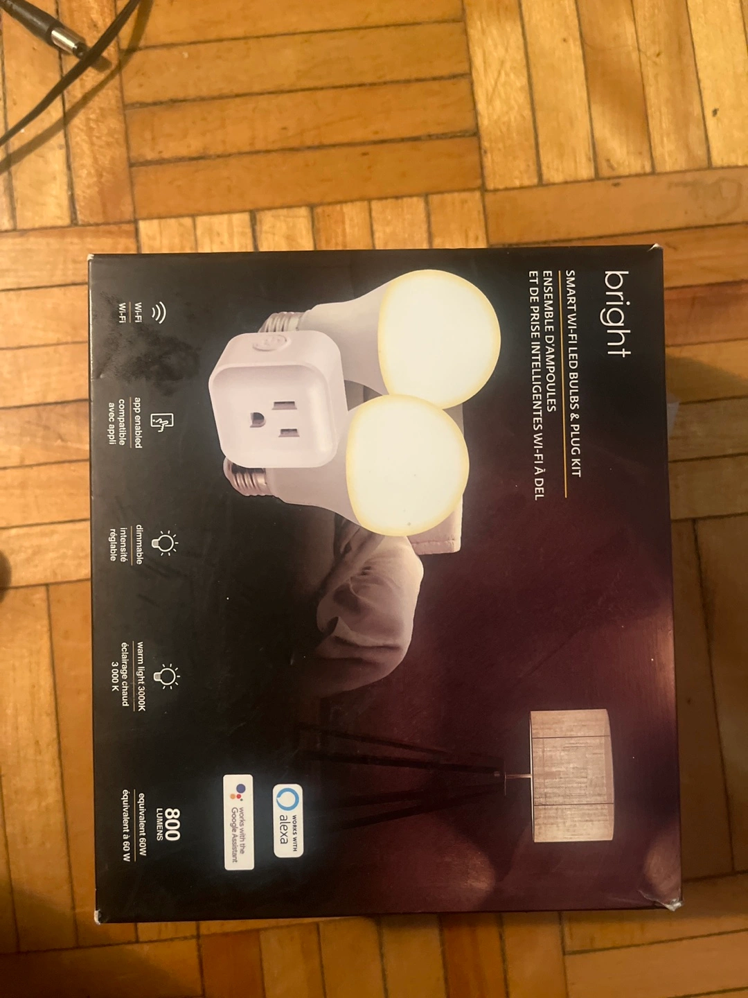New smart LED bulbs, WiFi enabled. Control lighting and appliances from your mobile device. Compatible with Google and Alexa. Includes two bulbs and a smart plug.
