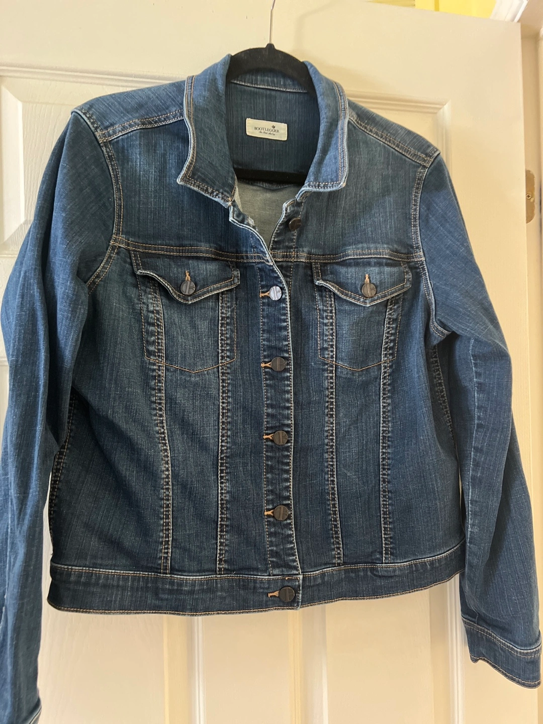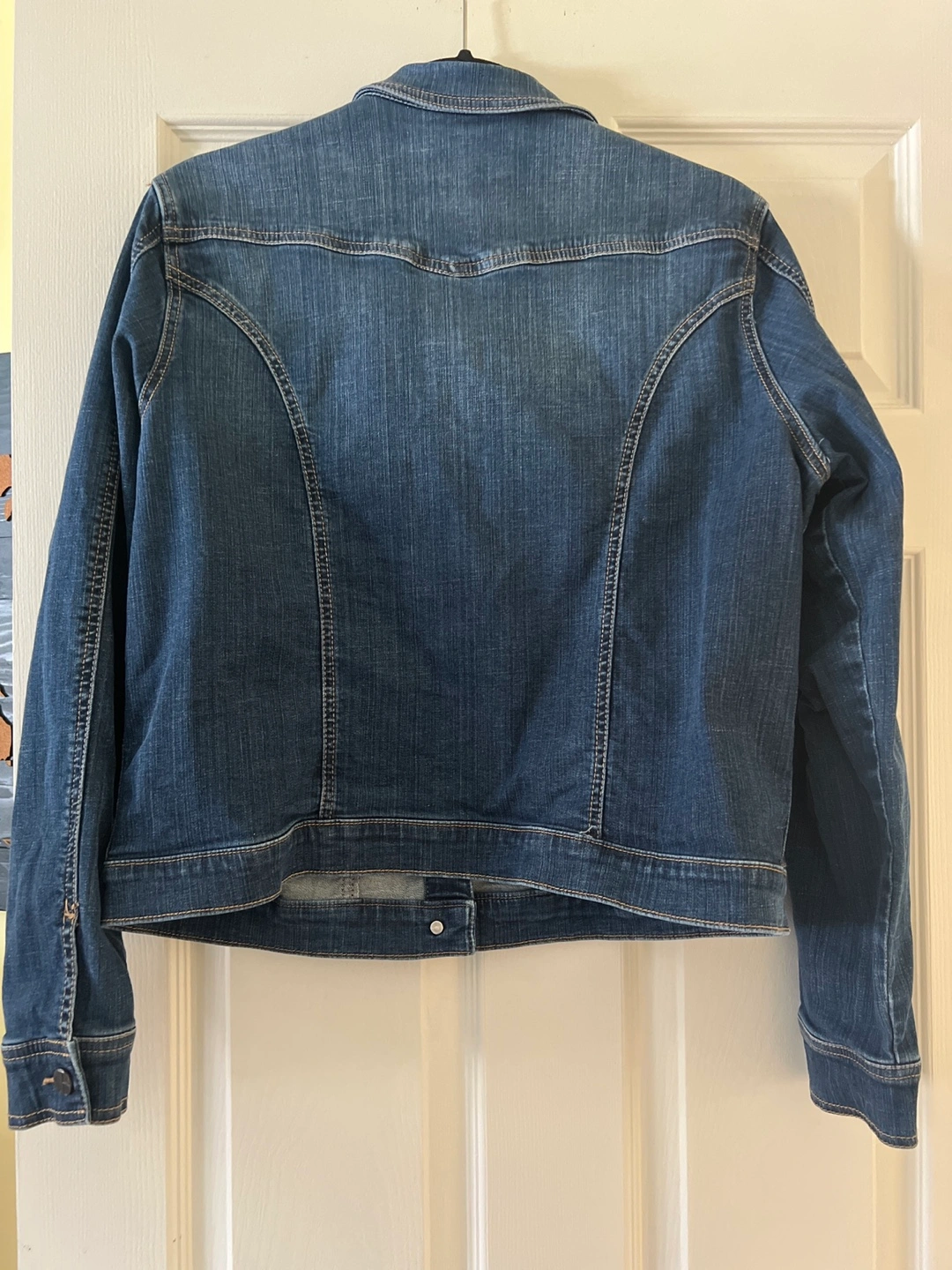 Women's dark wash denim jacket. Long sleeves, button closure. Two front pockets. Classic style.