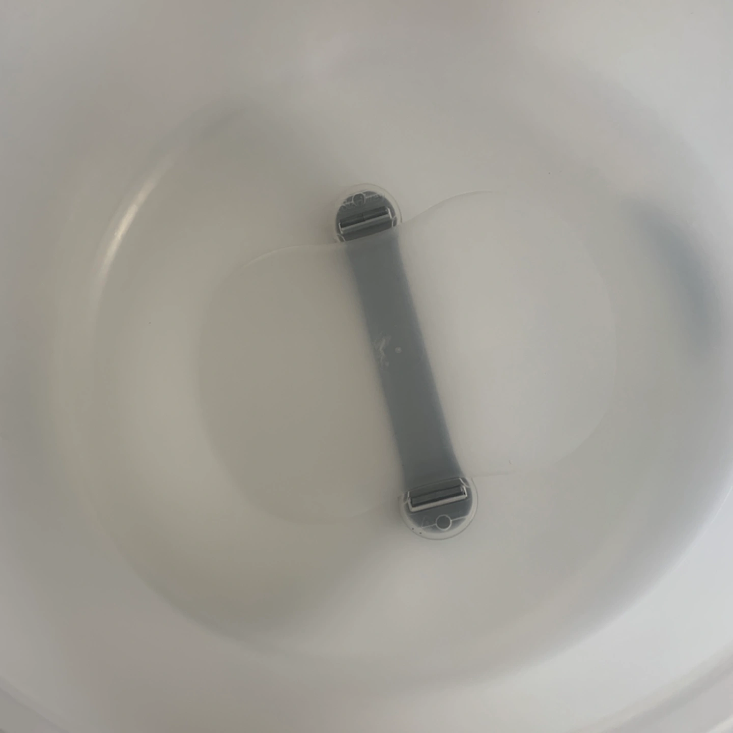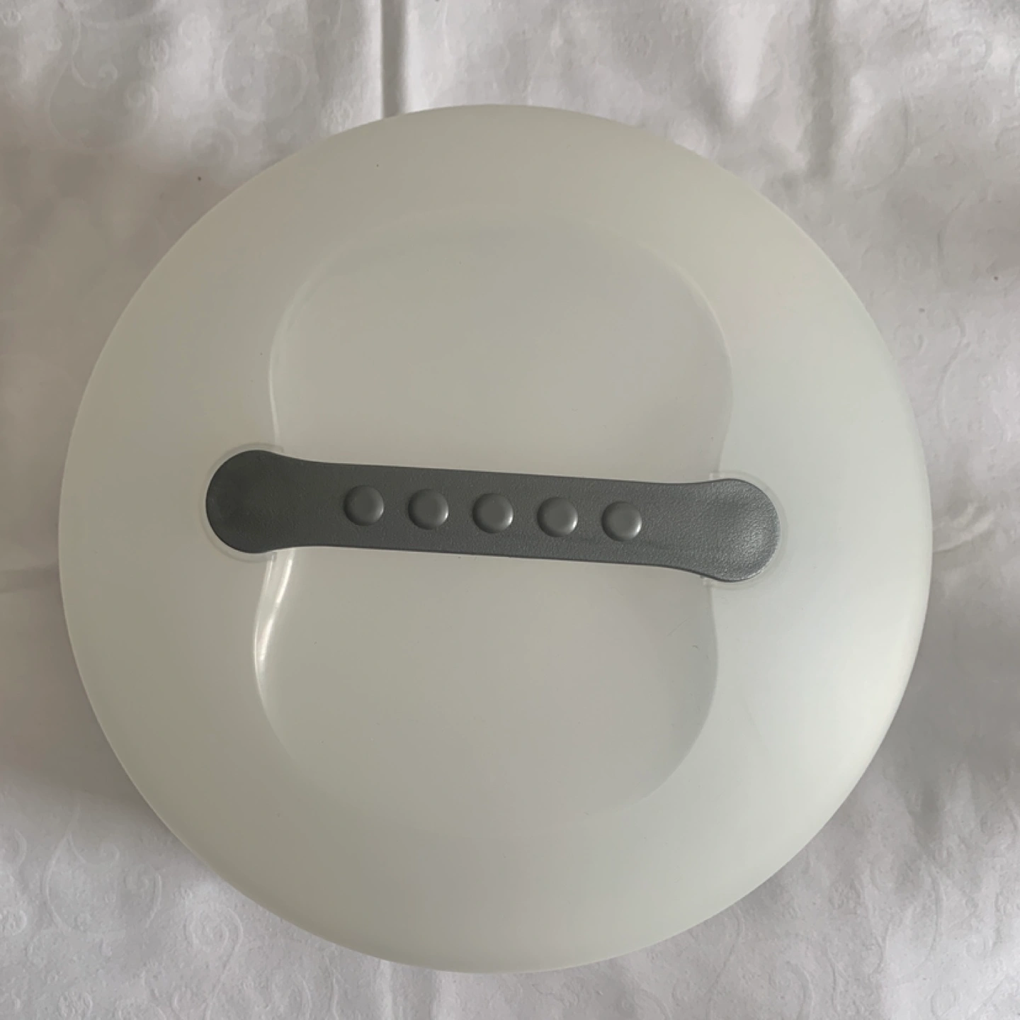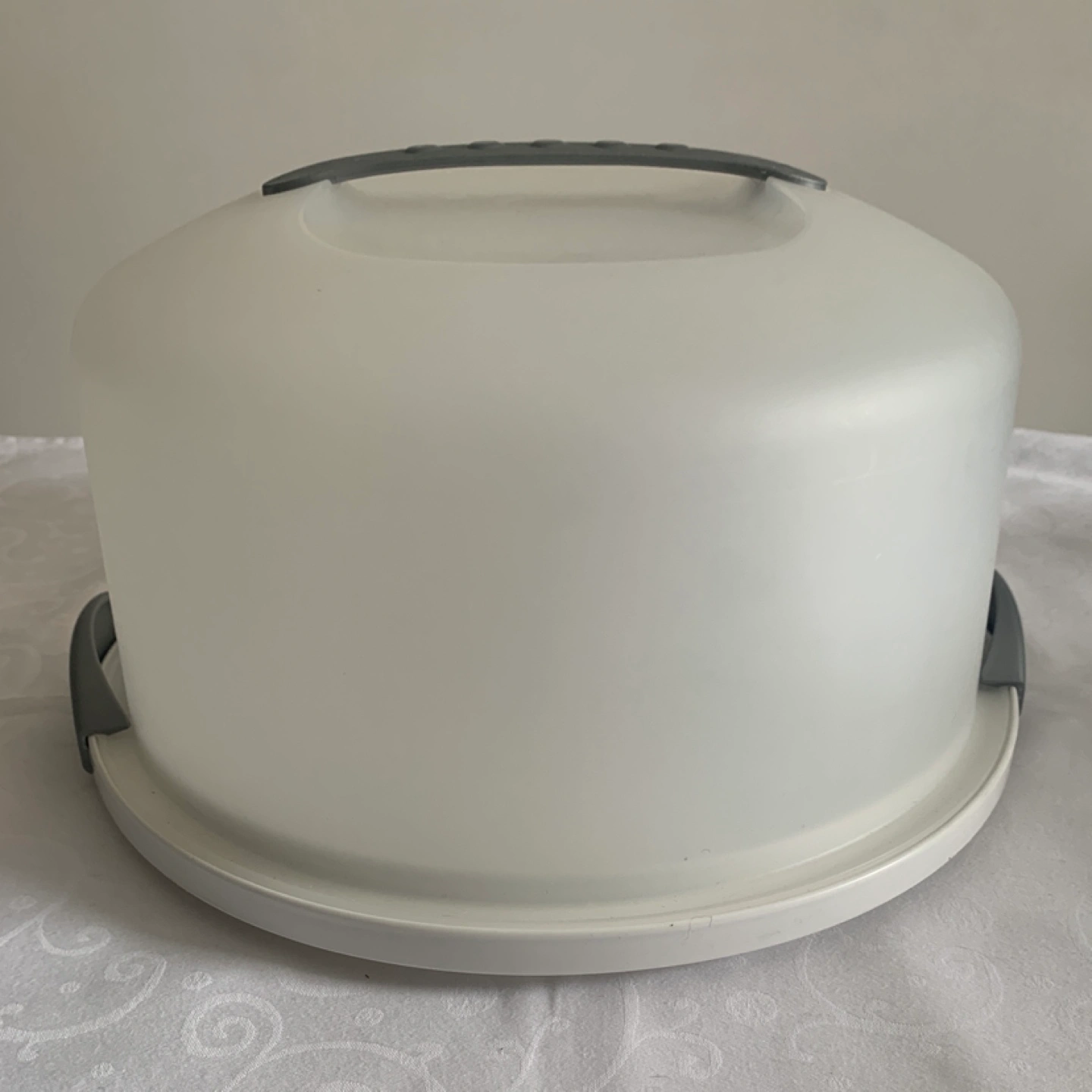 Round plastic cake/ dessert carrier. Features a grey handle and a separate white base. Secure clasp closure makes the container air tight.