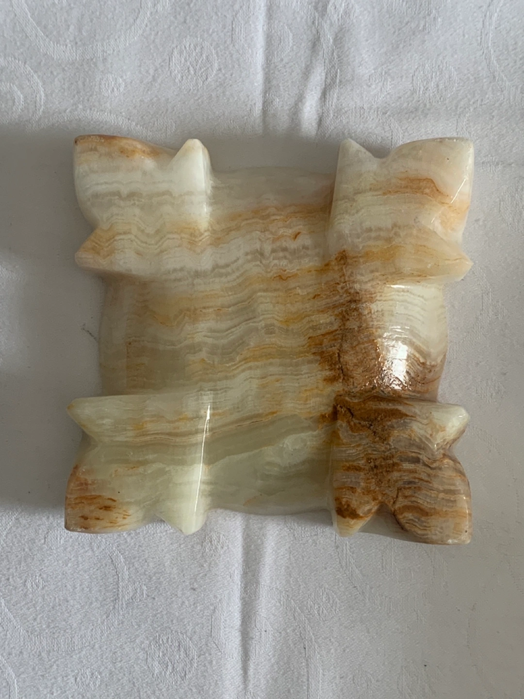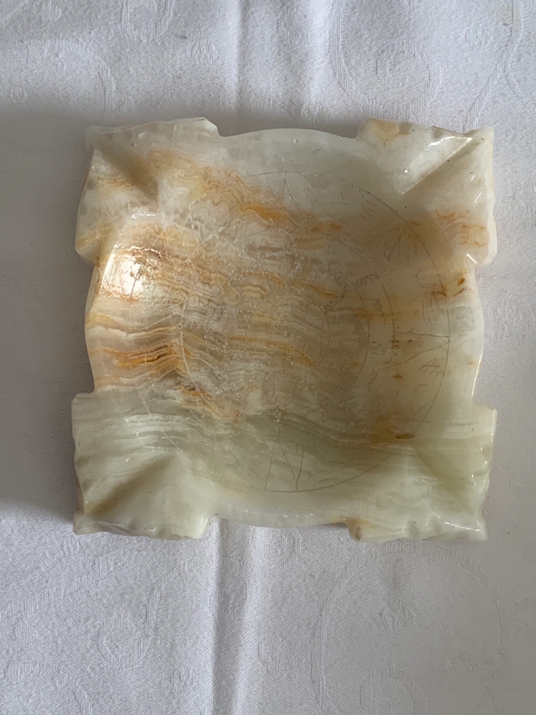 Small, square onyx ashtray. Intricate design with rounded details. Cream and brown marbling. Unique piece. Never used as an ashtray. Only used as a display piece. Available for pick-up (corner Laurier Ave W. / Lyon) Cash only - (e-transfers NOT possible).