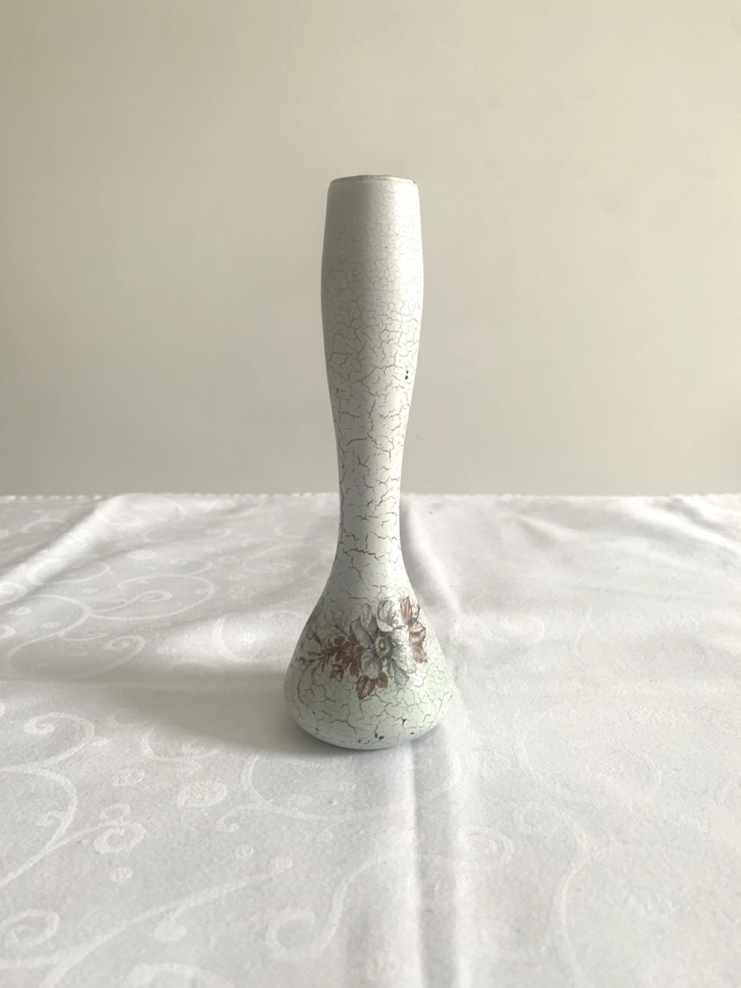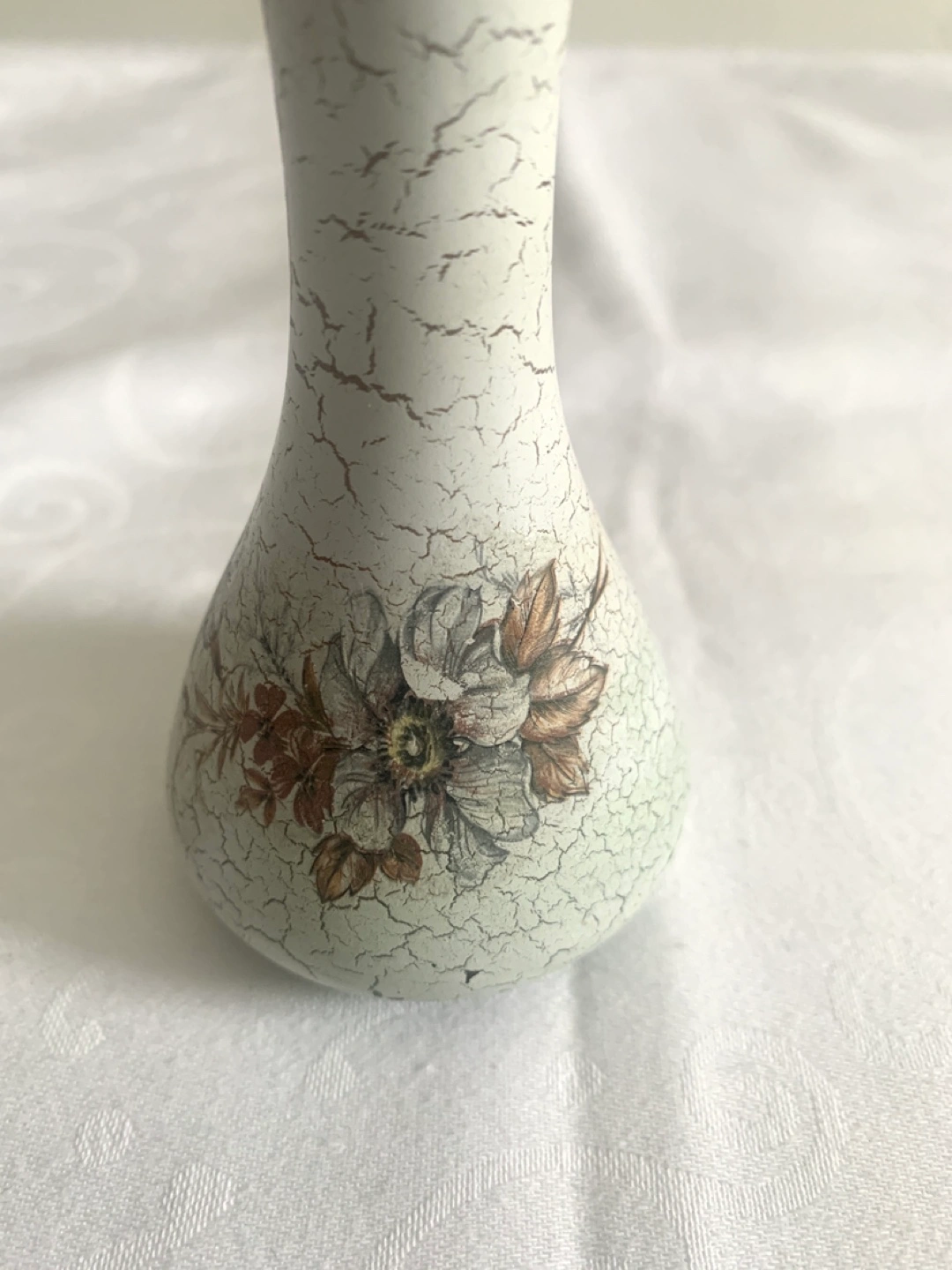 Small decorative vase. White crackle glaze finish. Floral design. Unique and charming addition to your home decor.