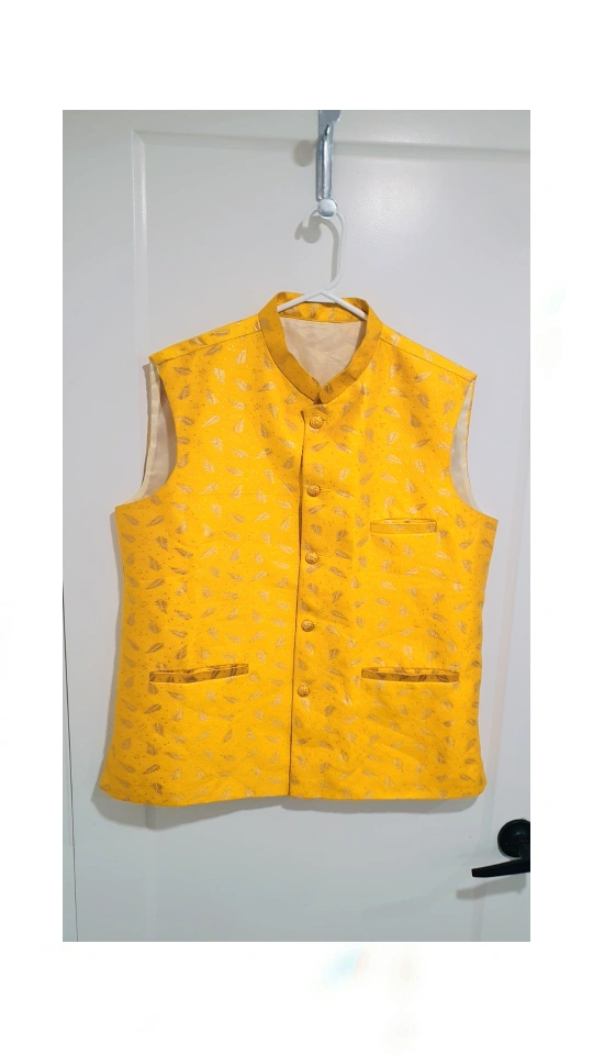 Elegant men's waistcoat. Features a mandarin collar, button front closure, and two front pockets. Available in mustard yellow. Floral pattern. Perfect for special occasions.