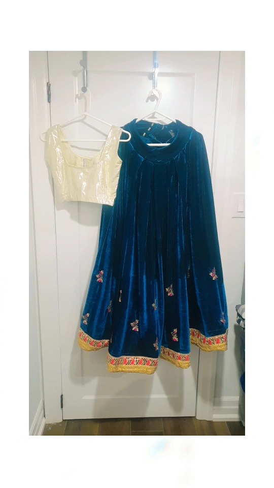 31Beautiful teal velvet lehenga choli. Features intricate embroidery and gold detailing. Choli included. Perfect for special occasions.