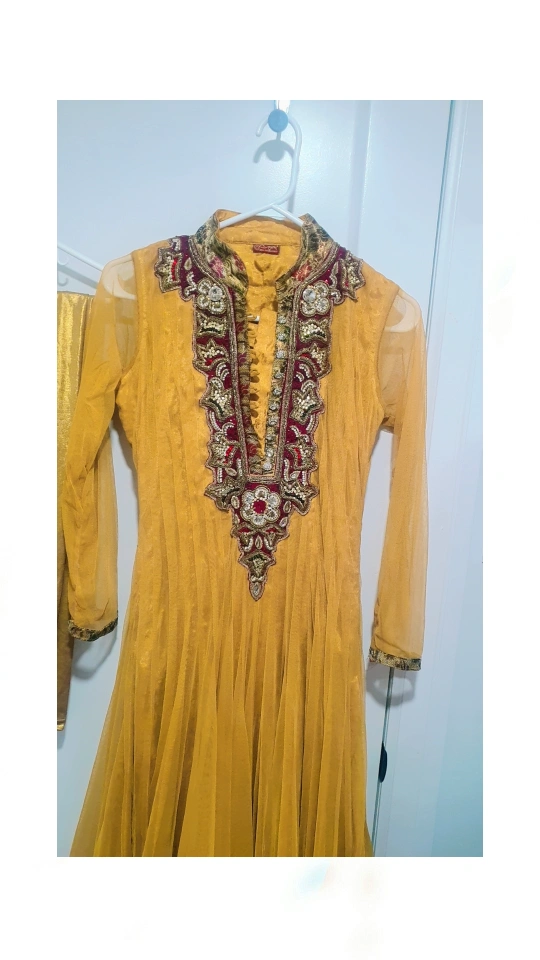 Beautiful mustard yellow Anarkali suit. Long sleeves, embroidered neckline. Comes with matching dupatta in maroon and gold. Floor-length. Elegant and festive. Perfect for weddings or special occasions.