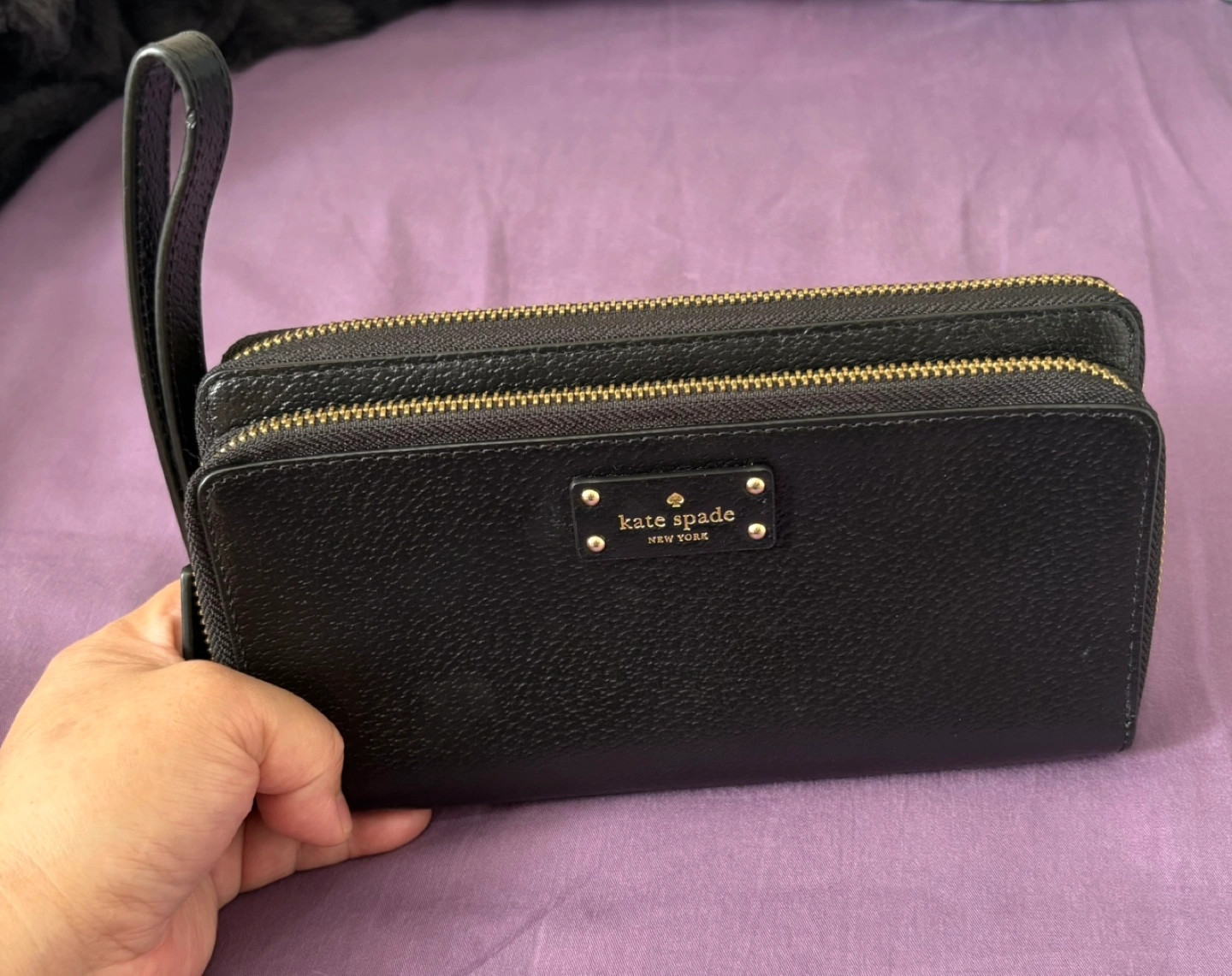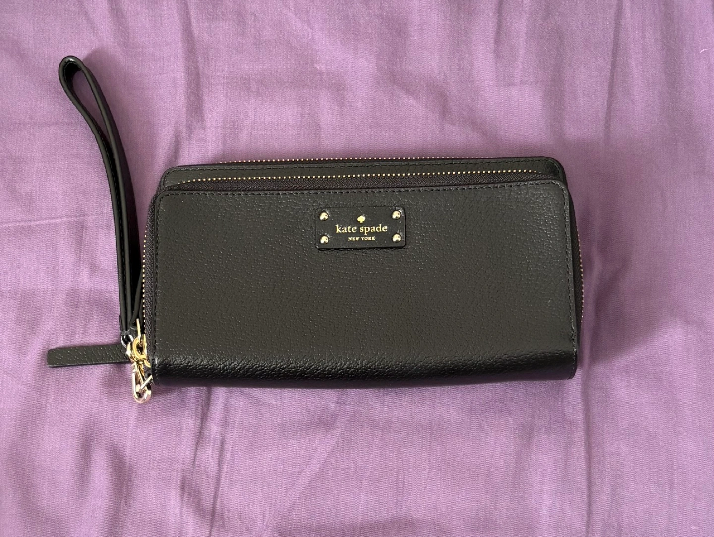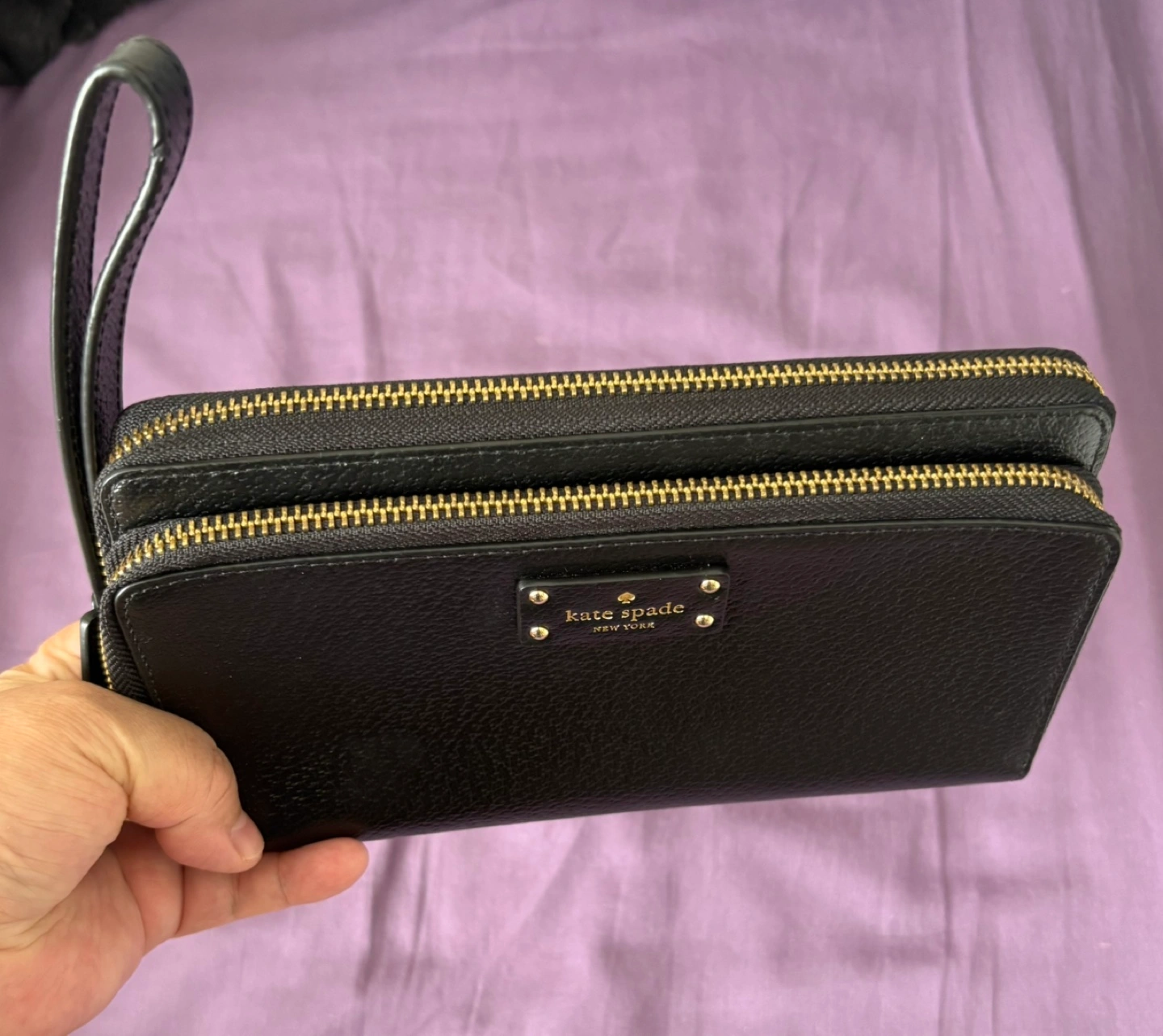 677Black leather wallet. Double zip closure. Wristlet strap. In Excellent condition. Barely used.