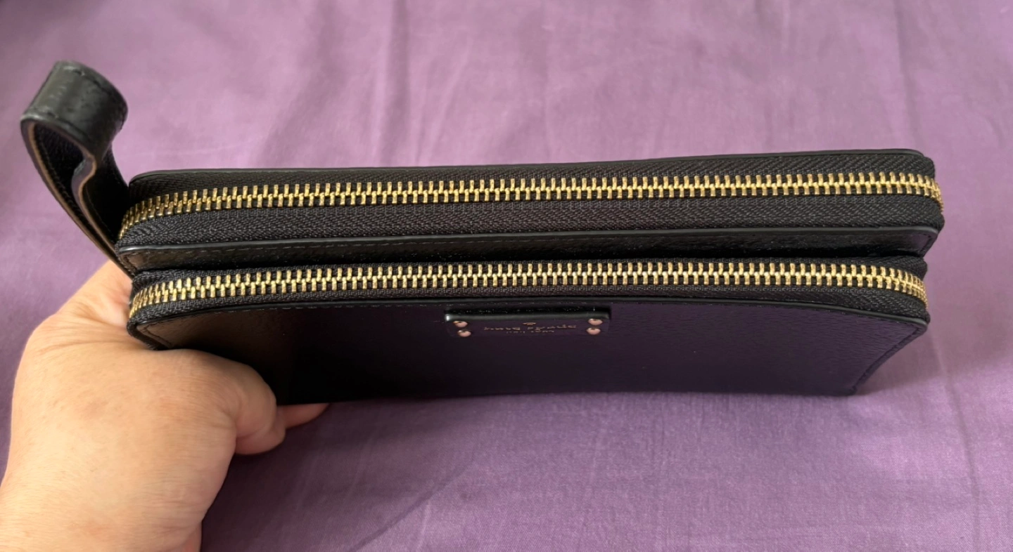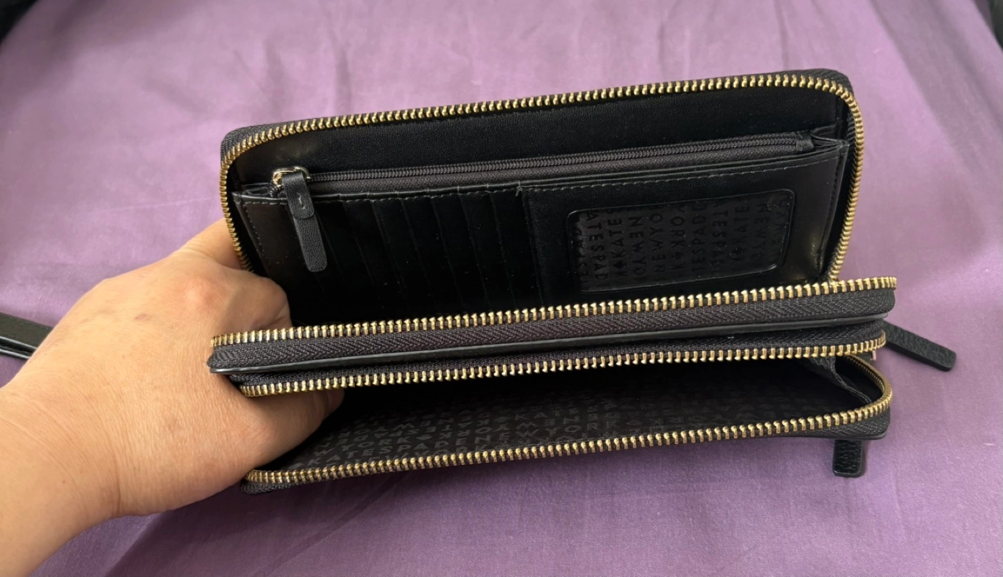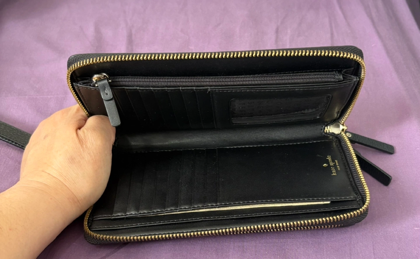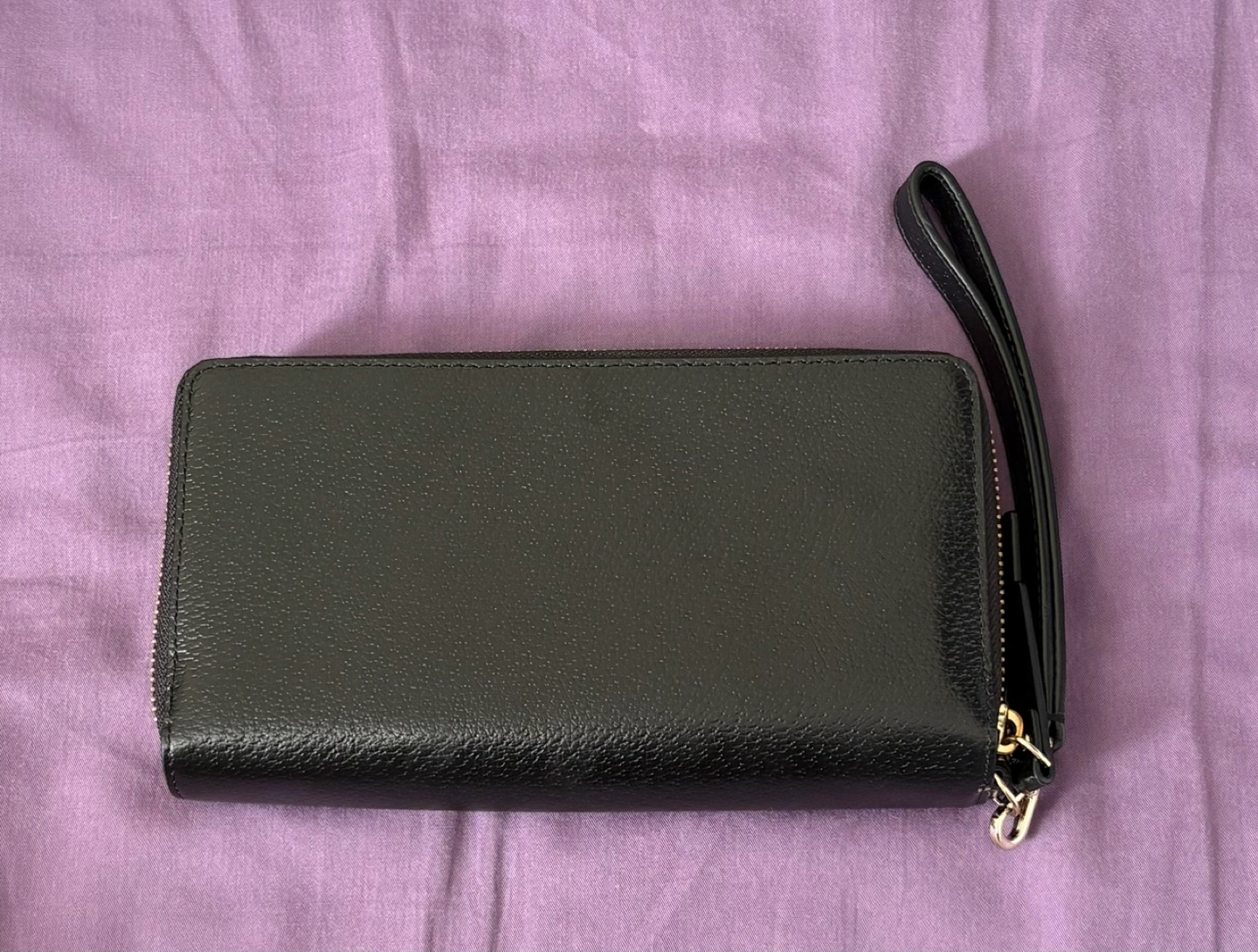677Black leather wallet. Double zip closure. Wristlet strap. In Excellent condition. Barely used.