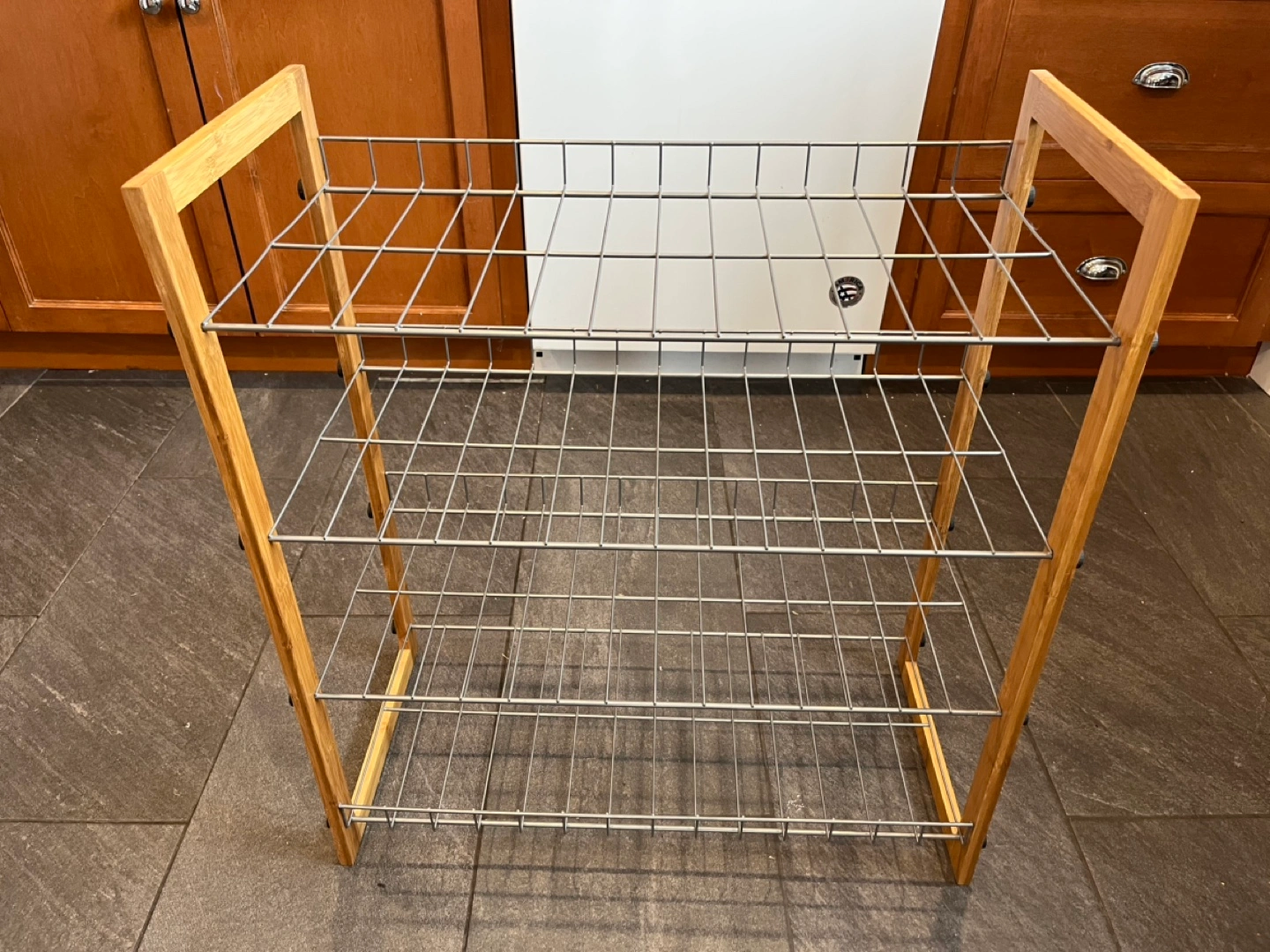 Three-tier shoe rack. Bamboo frame. Metal wire shelves. Great for organizing shoes or other small items. Good condition. Height 27” / Width 24” /Depth 11.5” - pickup only, near Oaklands elementary school