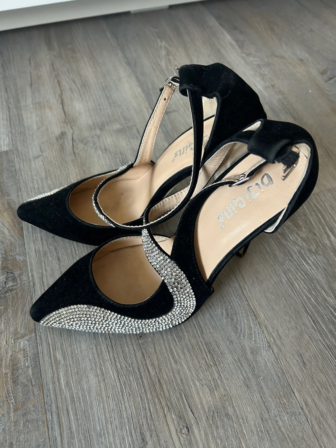 Elegant black stiletto heels. Rhinestone detailing. Ankle strap closure. Pointed toe. Great for special occasions.