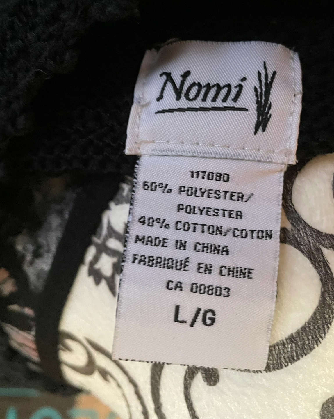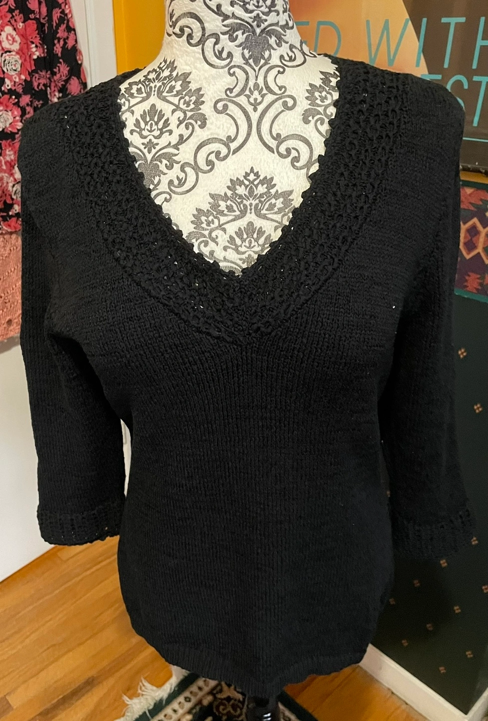 Black knit sweater. V-neck. Three-quarter sleeves. Intricate neckline detail. 60% polyester/40% cotton blend. Made in China.