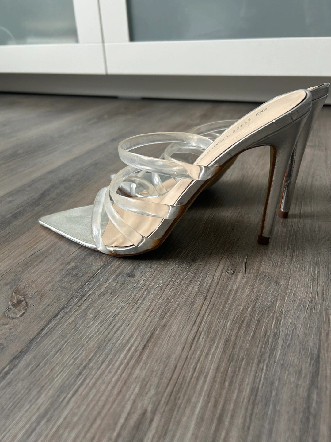 Silver pointed-toe heeled mules. Clear straps. Stylish and elegant footwear.