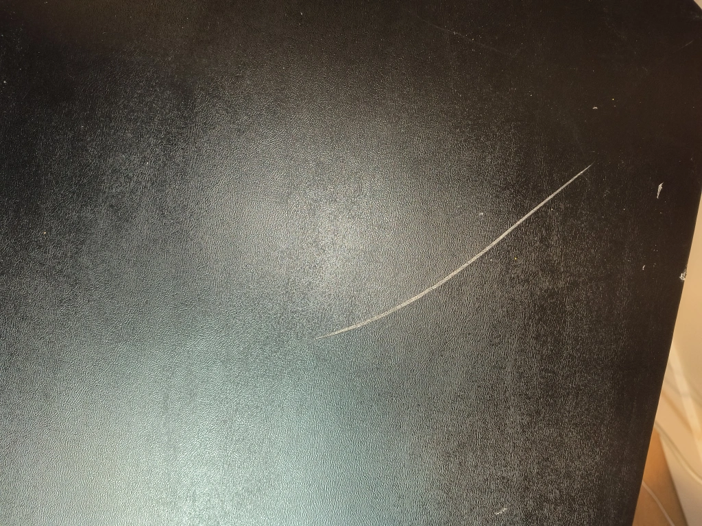 Small black foldable table. Square top, black metal legs. Minor surface scratches. Approximately 34 inches across.