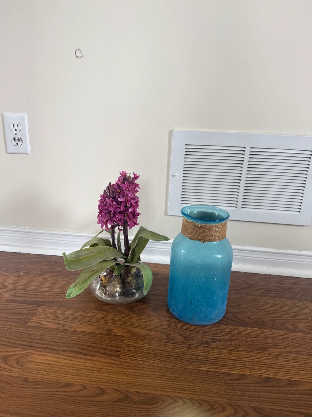 Decorative blue glass vase with a jute tie. Includes a small glass bowl with a purple artificial flower arrangement. Perfect for home décor.
