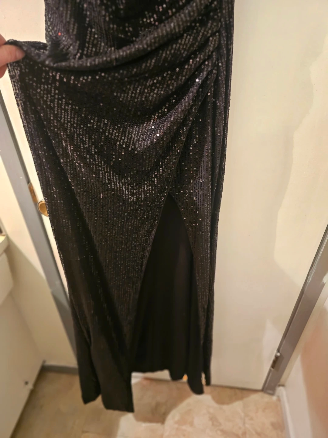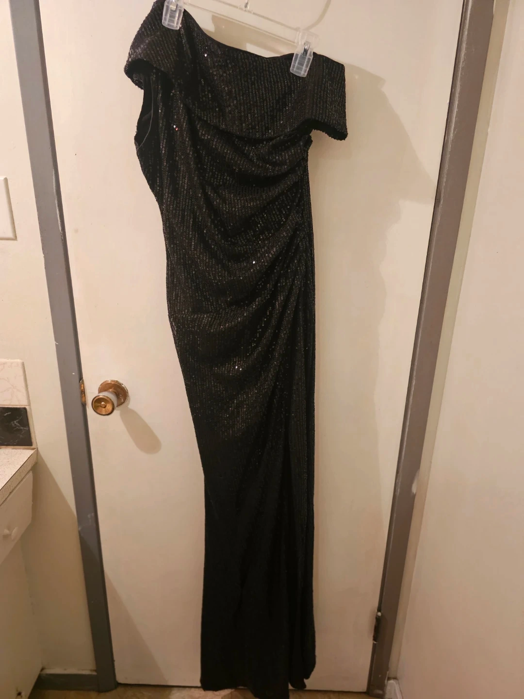 This FAERIESTY gown features a dazzling black sequin finish with an elegant off-the-shoulder neckline and a flattering ruched detail. It's a size small and has a stylish side slit for added flair. This dress is perfect for formal events and parties!
